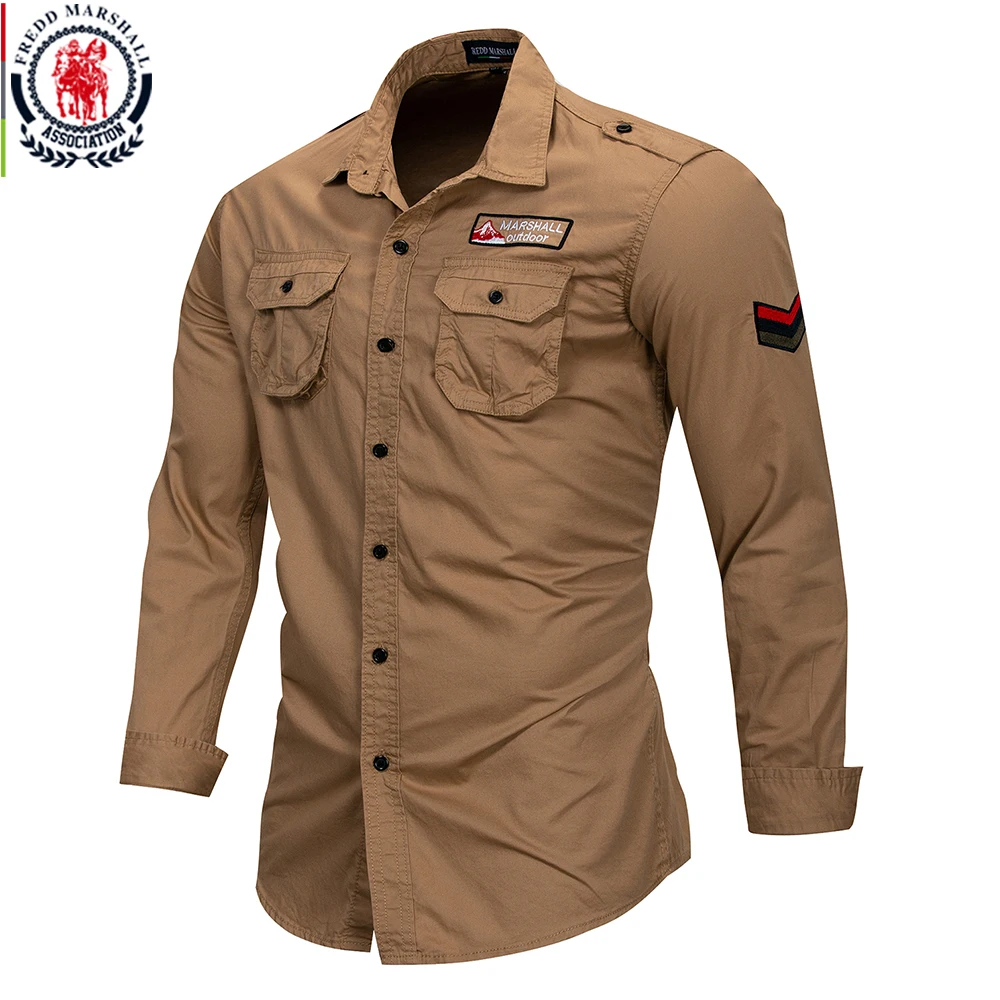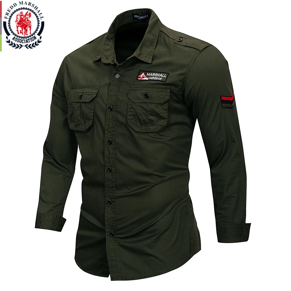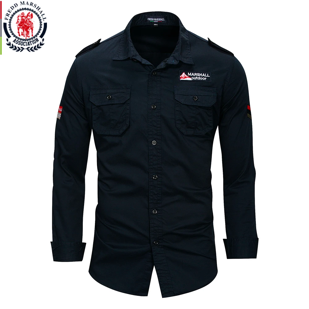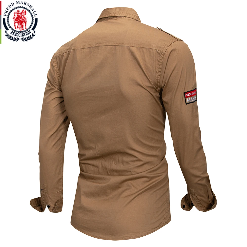 Fredd Marshall 100% Cotton Military Shirt Men Long Sleeve Casual Dress Shirt Male Cargo Work Shirts With Embroidery 115