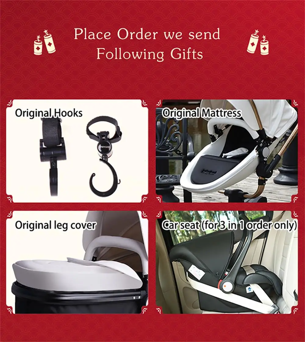 Buy stroller now send following big gifts: mattress , leg cover, mosquito net , high quality hooks,cup holder .