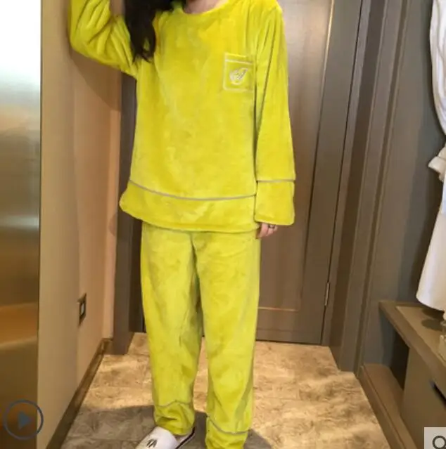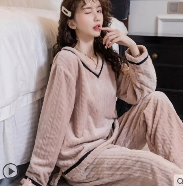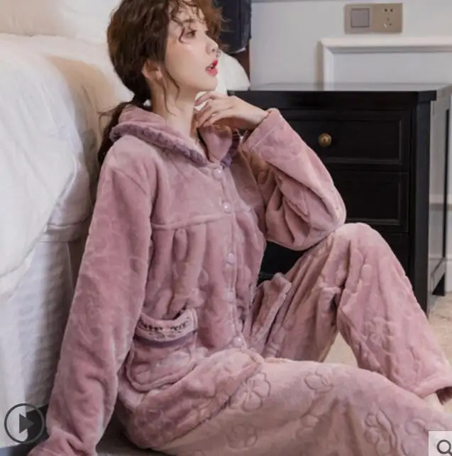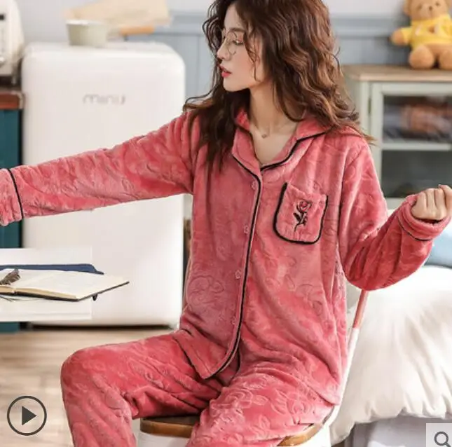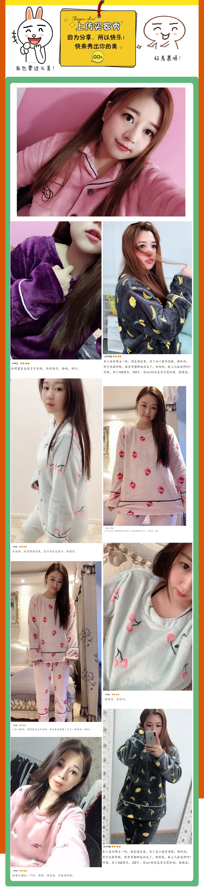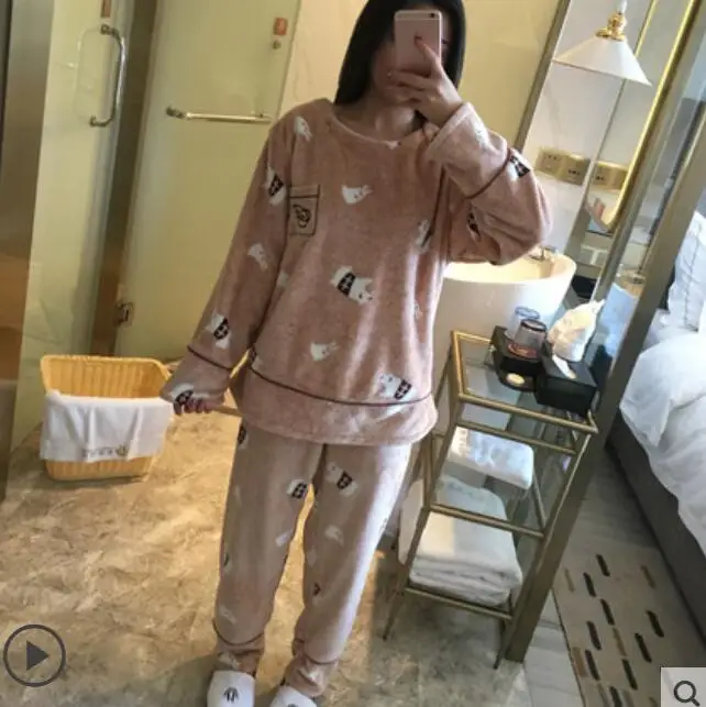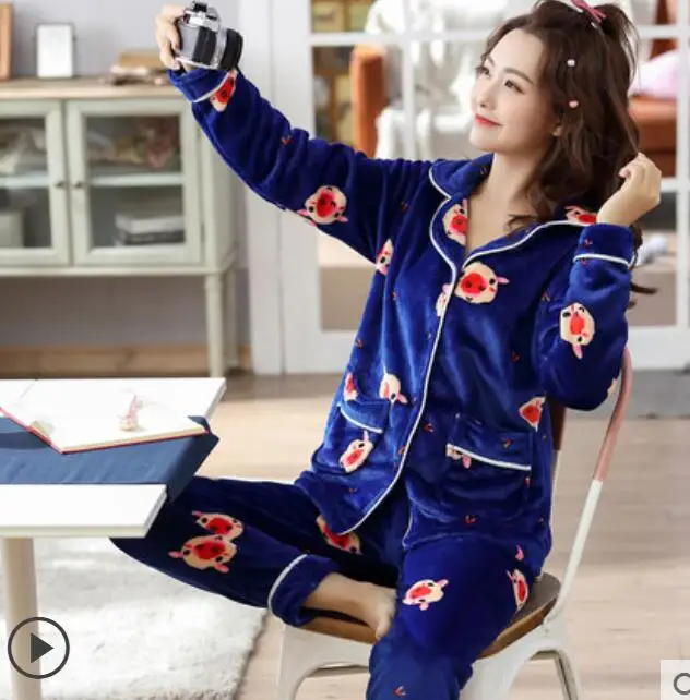 korean Flannel Warm Pajamas for Women Long Sleeve Home Suit Ladies sleepwear cartoon Velvet Pajama set Thick Feminino Pyjamas