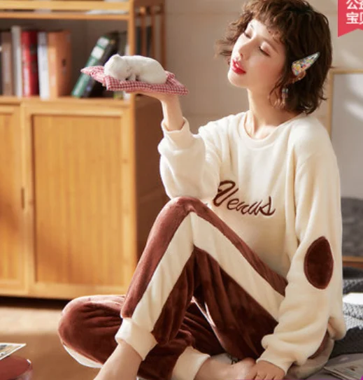 korean Flannel Warm Pajamas for Women Long Sleeve Home Suit Ladies sleepwear cartoon Velvet Pajama set Thick Feminino Pyjamas