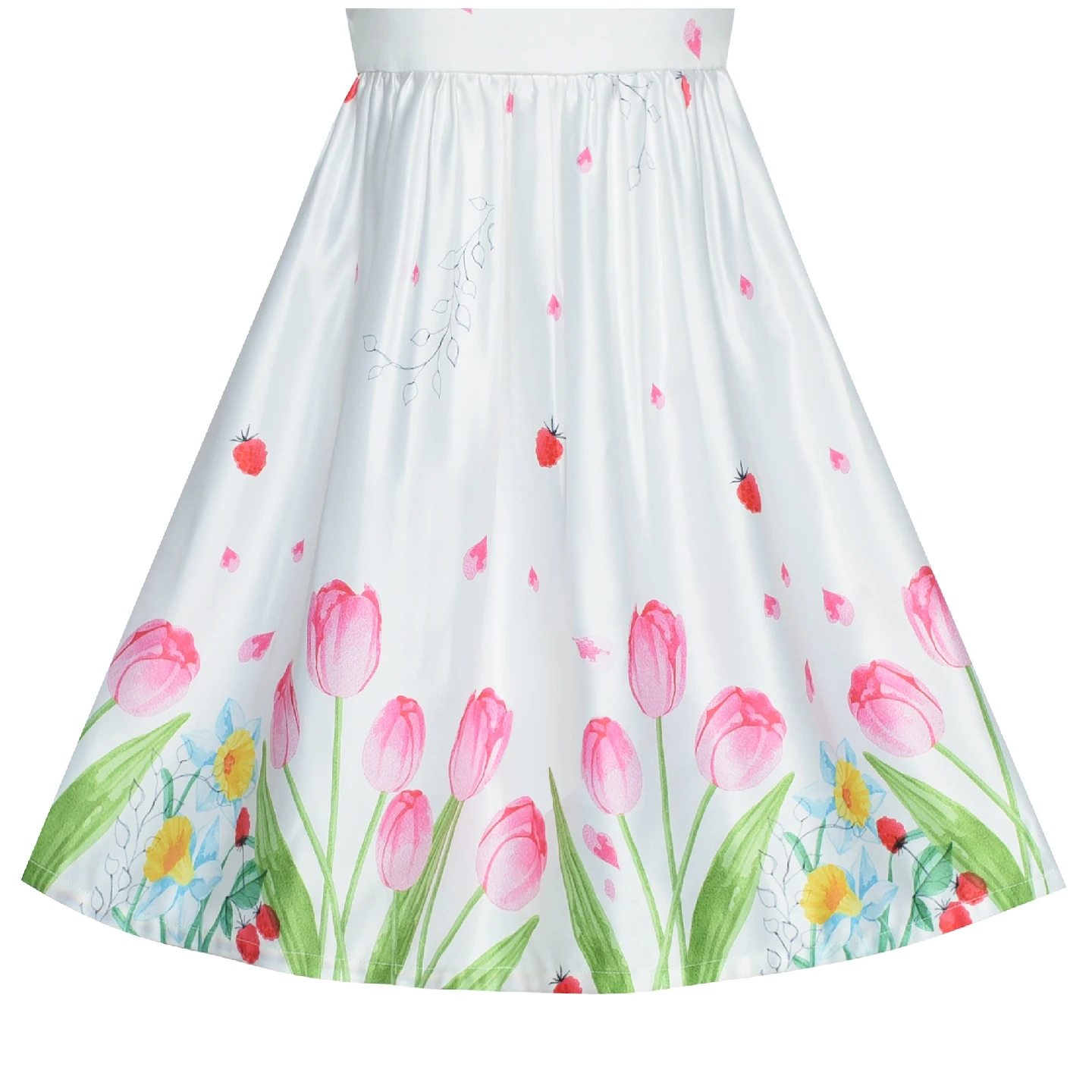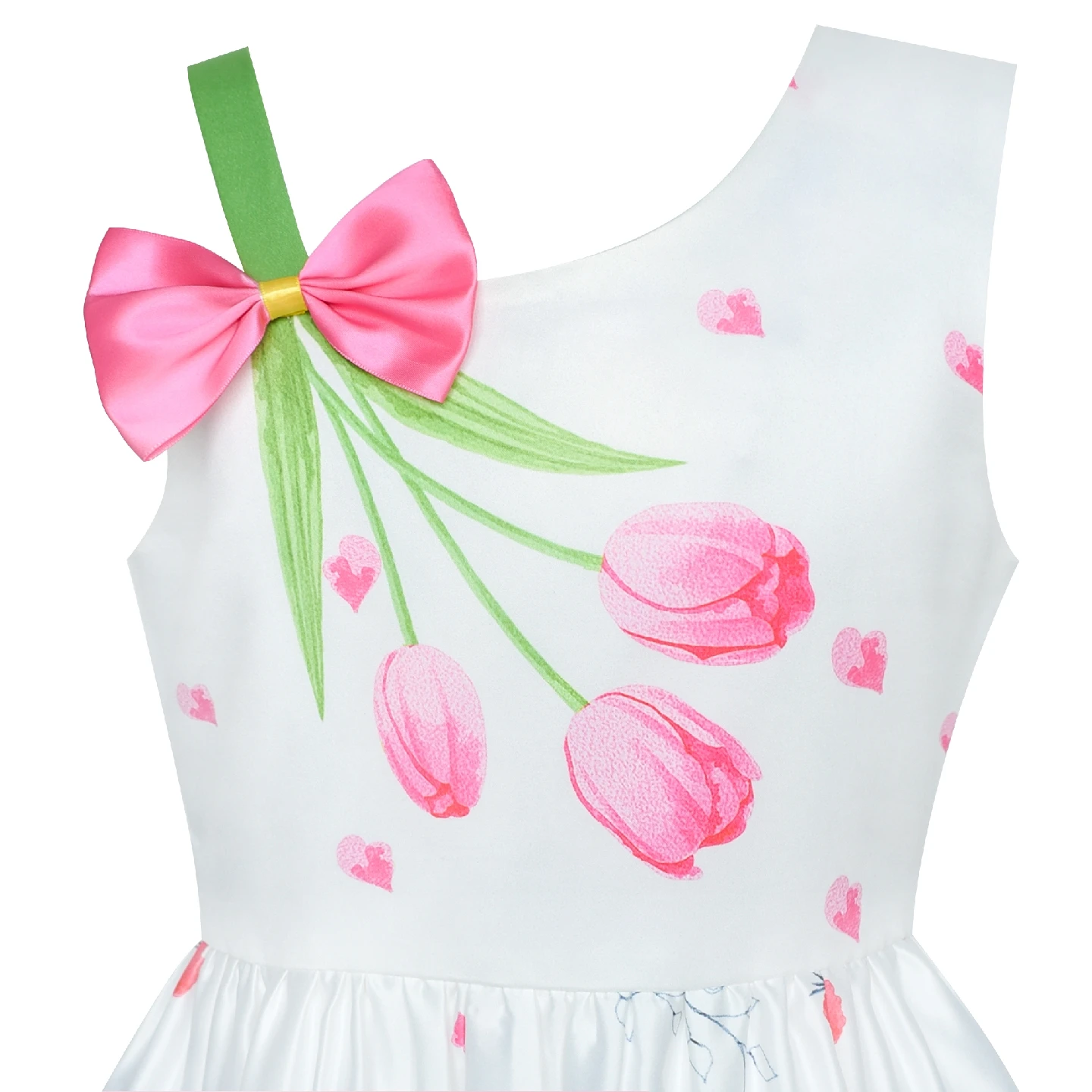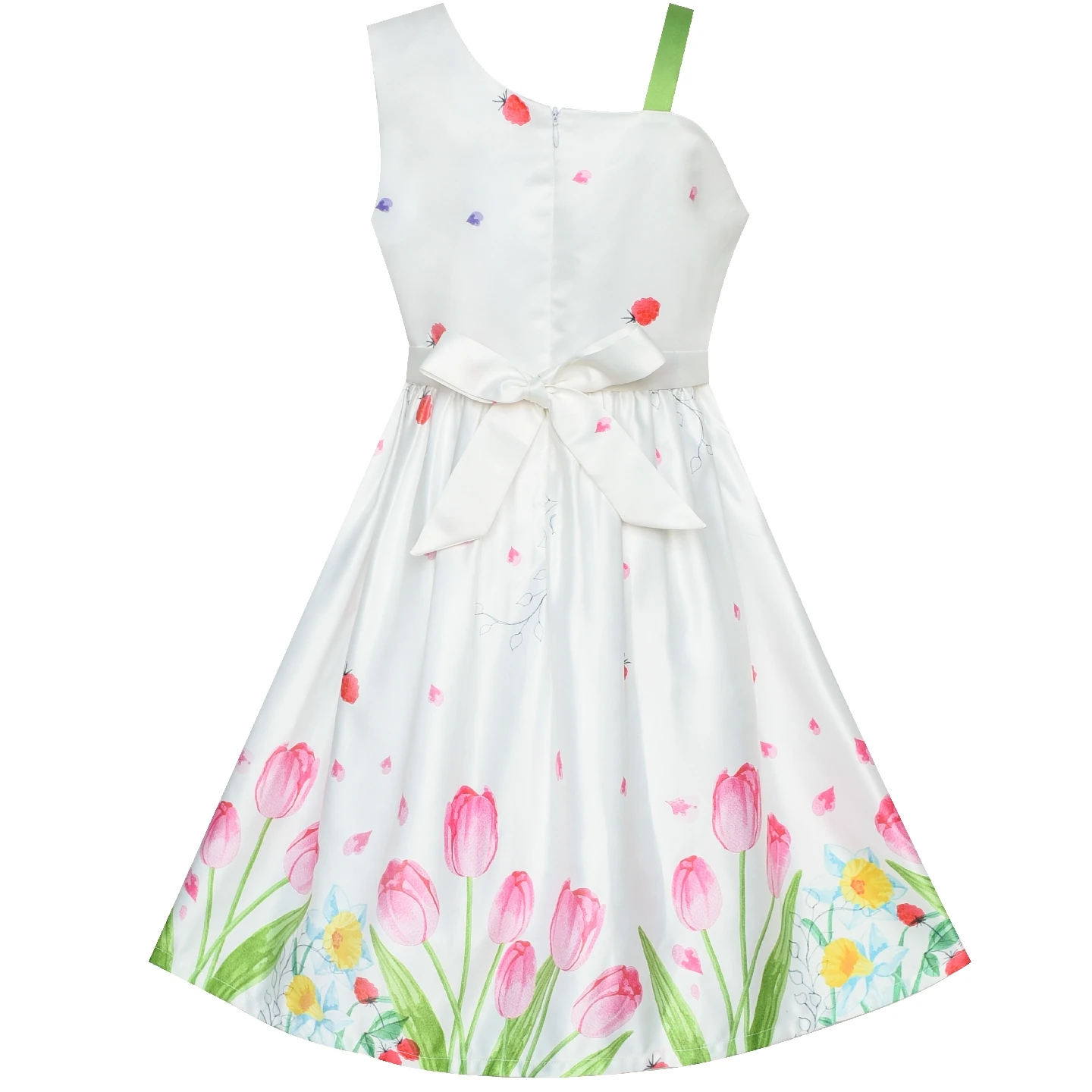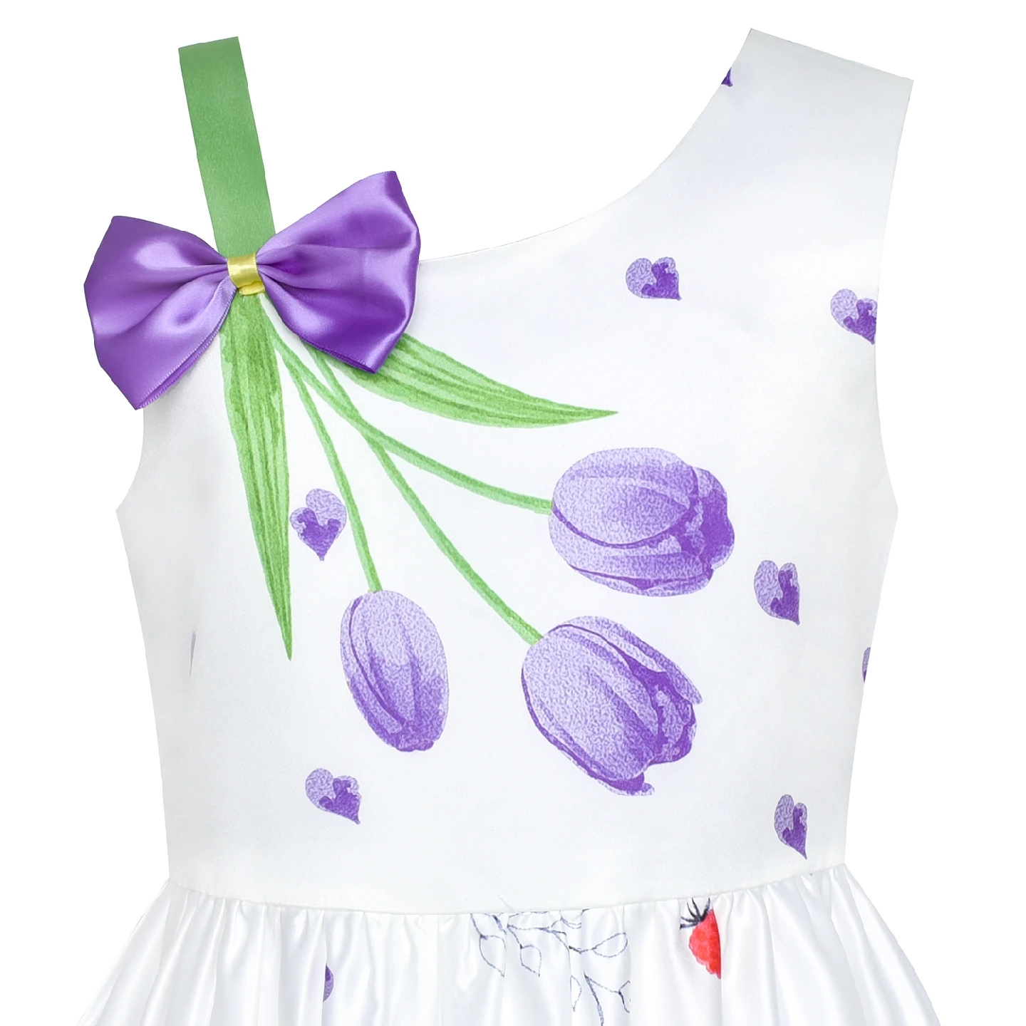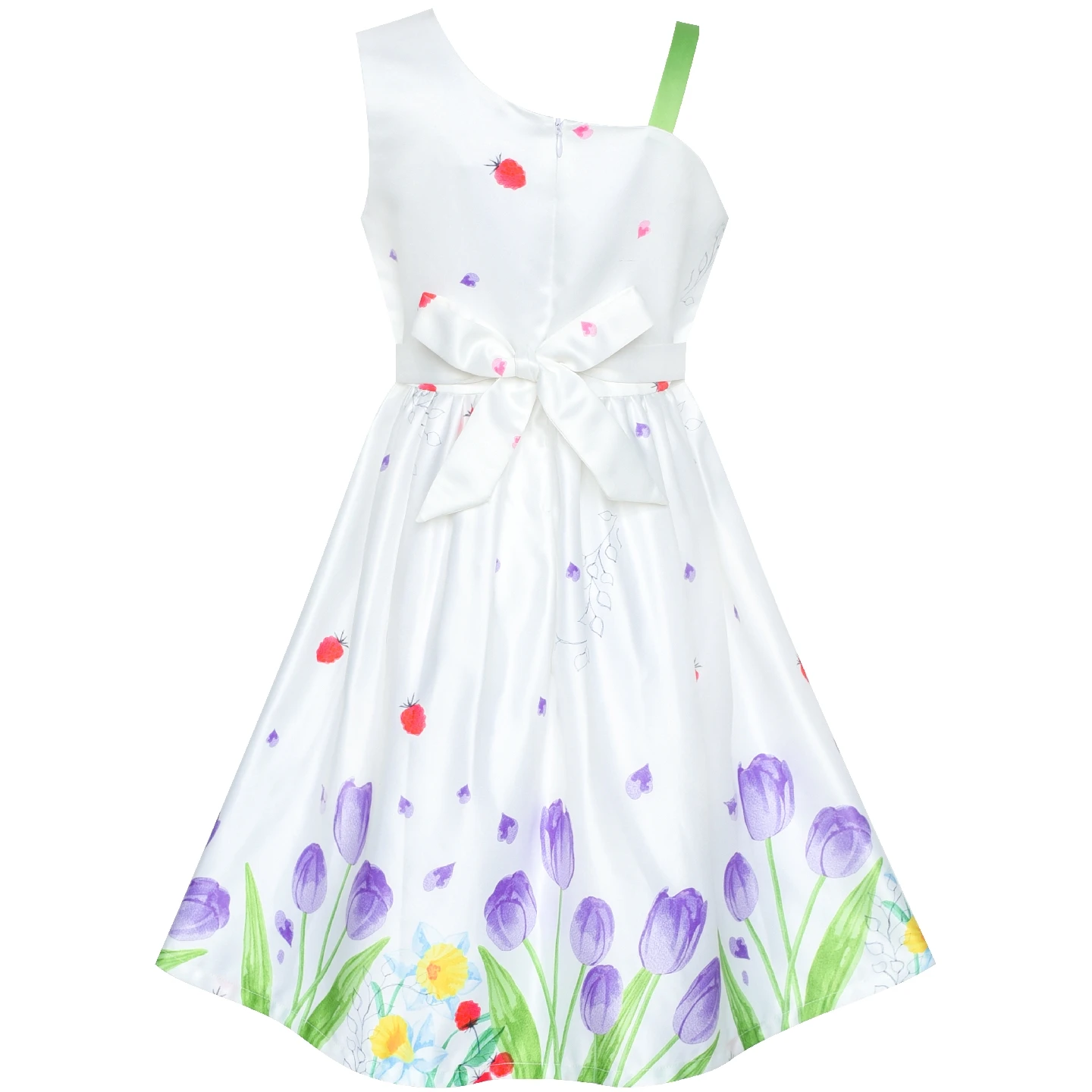 Unique design one shoulder dress for your little girls and big girls. Eye-catching bow tie on shoulder. Abundant tulip flower print makes this dress a garden party dream. Perfect for spring party, Easter party, wedding party and everyday wearing. Following size means age ranges for girls, they are for general guidance only. For most accurate fit, we recommend checking detailed measurement before purchase.