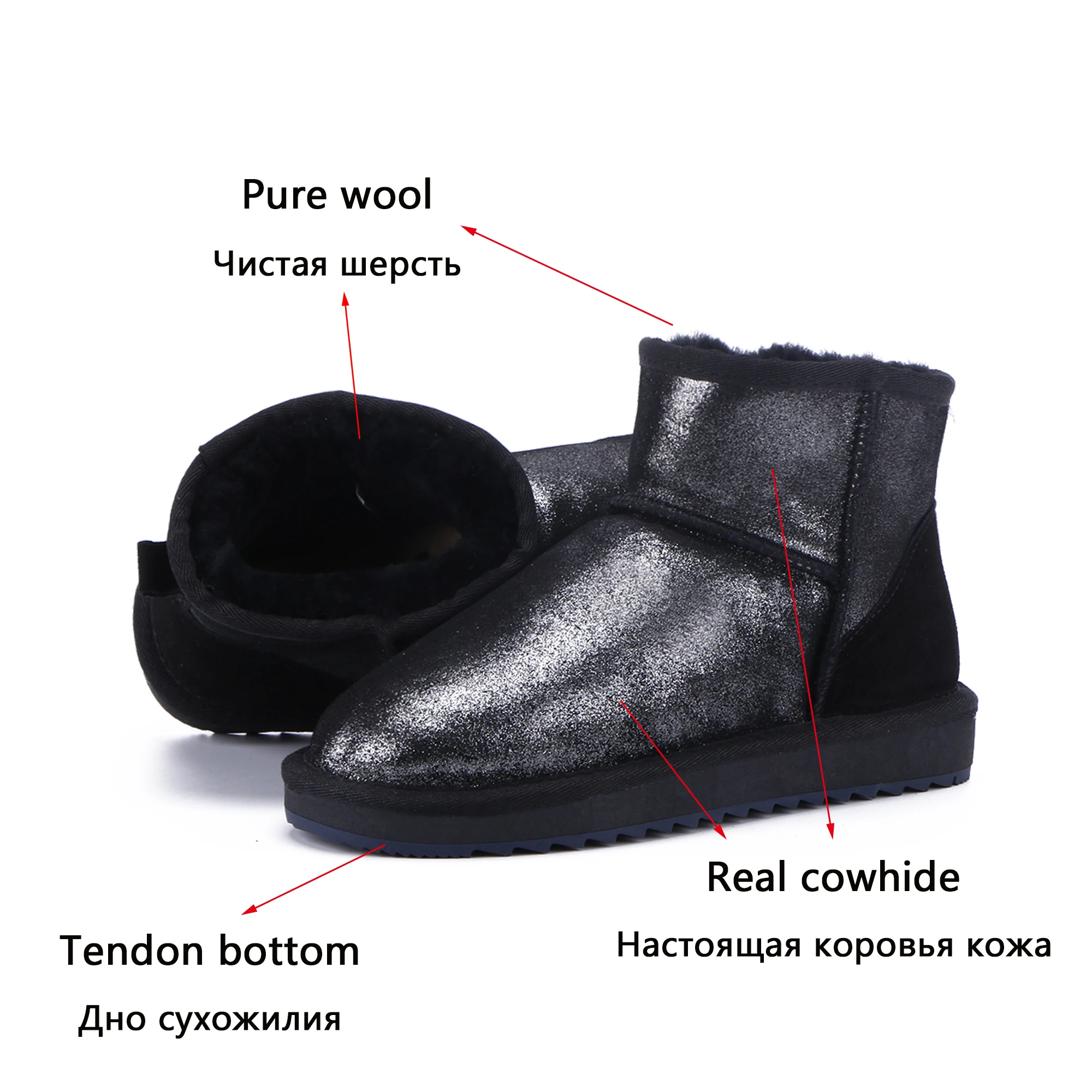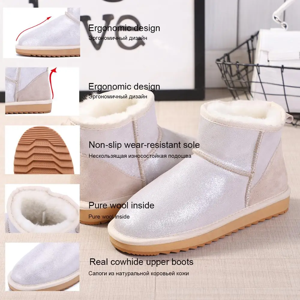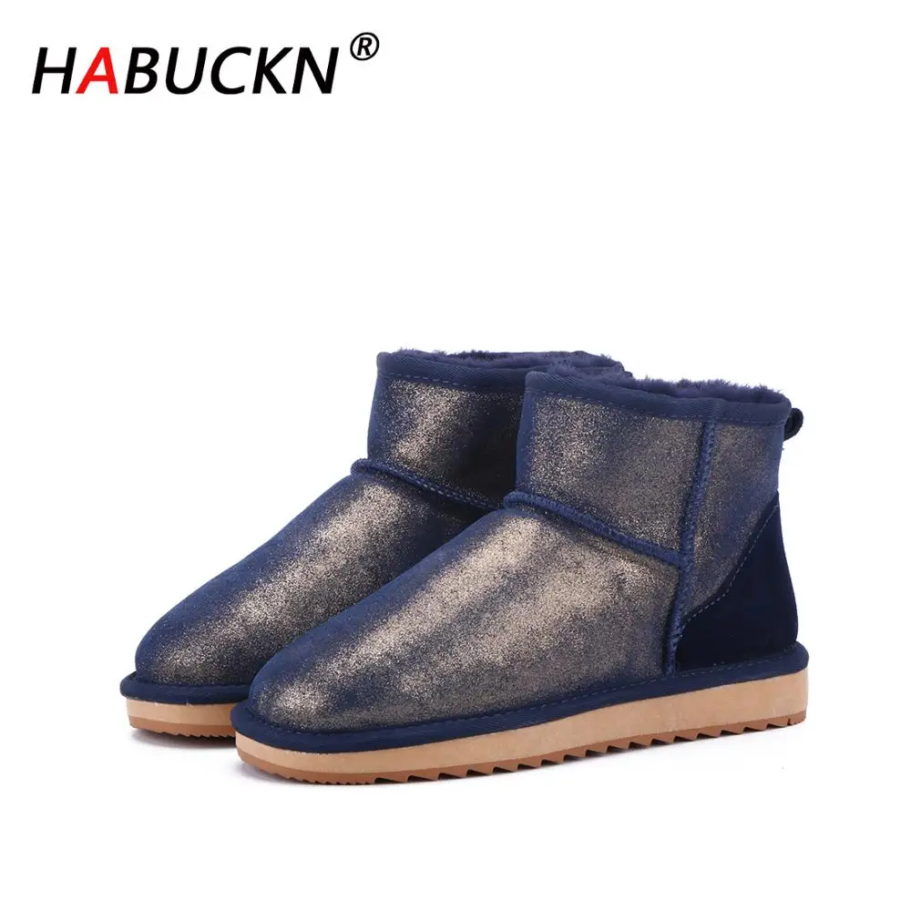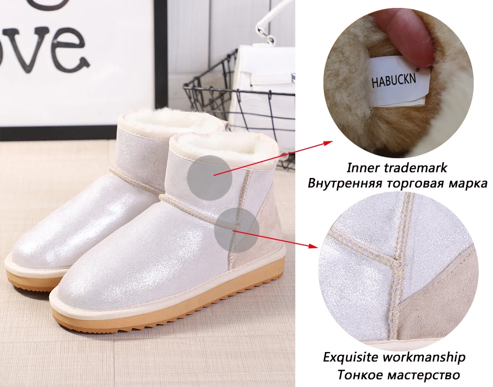 HABUCKN Fashion Classic Cowhide Leather Wool Lined Women Winter Ankle Snow Boots for Women Short Basic Winter Shoes Large Size