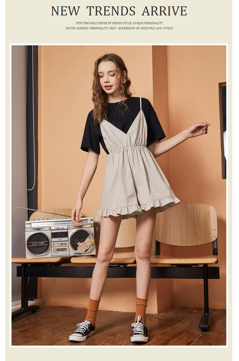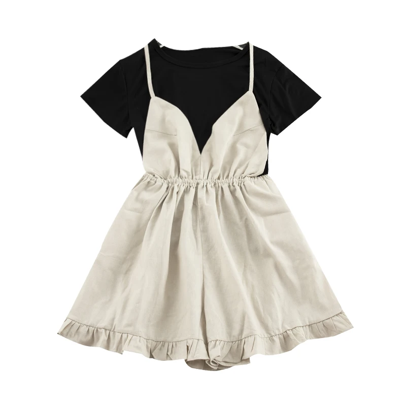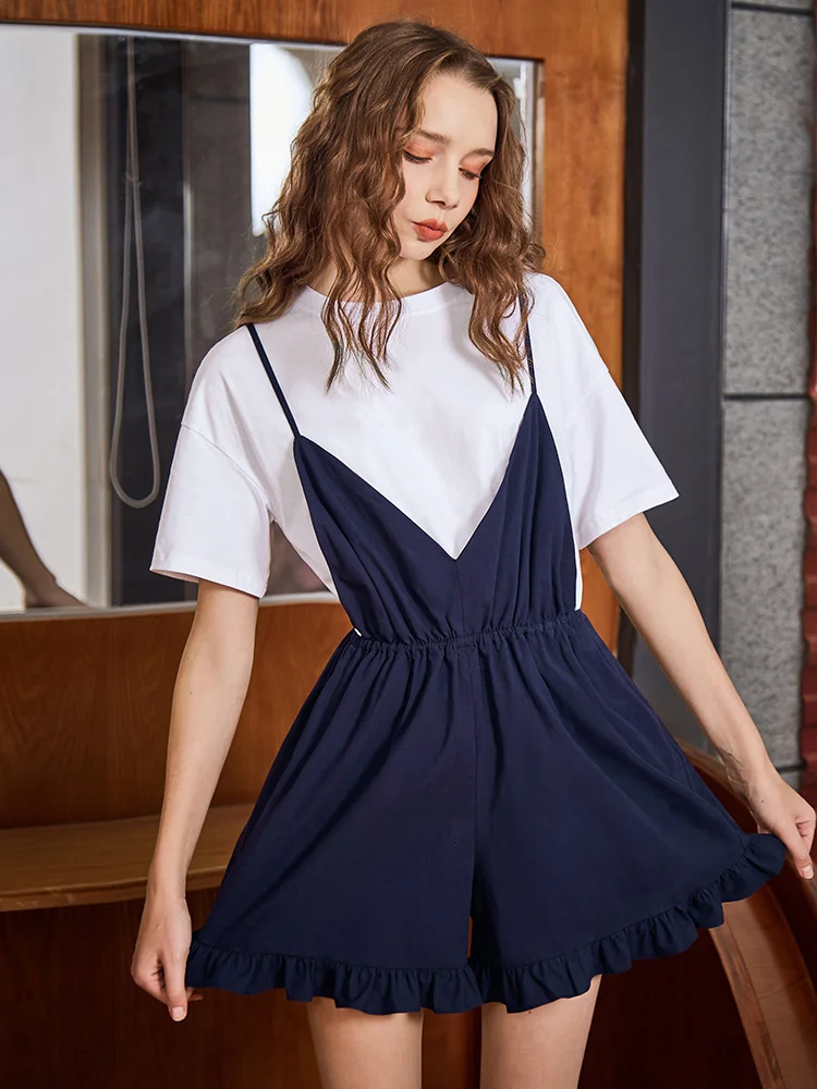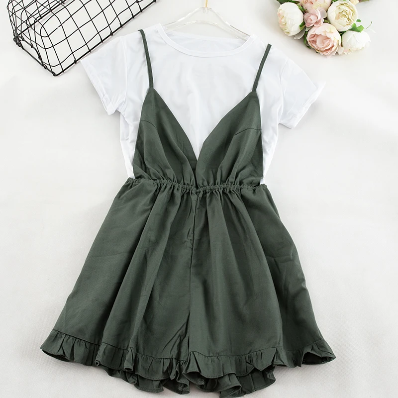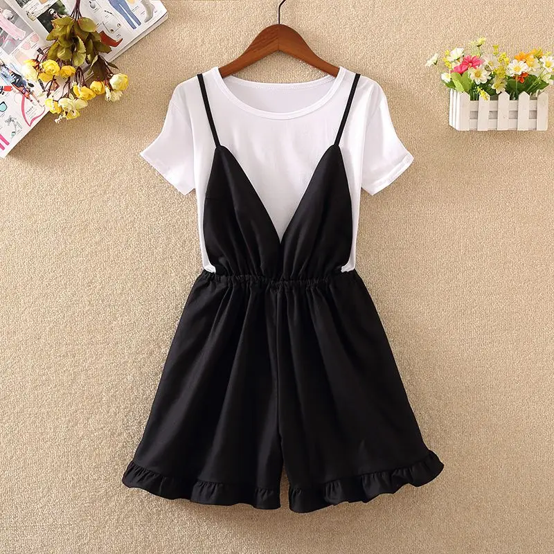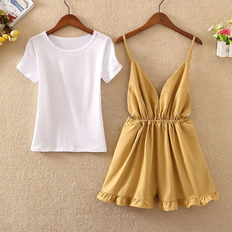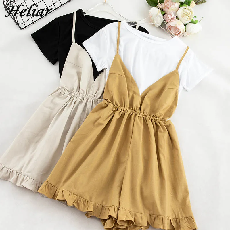 HELIAR Women Playsuits and T-shirts Lady Solid Tees Spaghetti High Waist Rompers Two Pcs Outfits Cloth Summer Female Playsuit