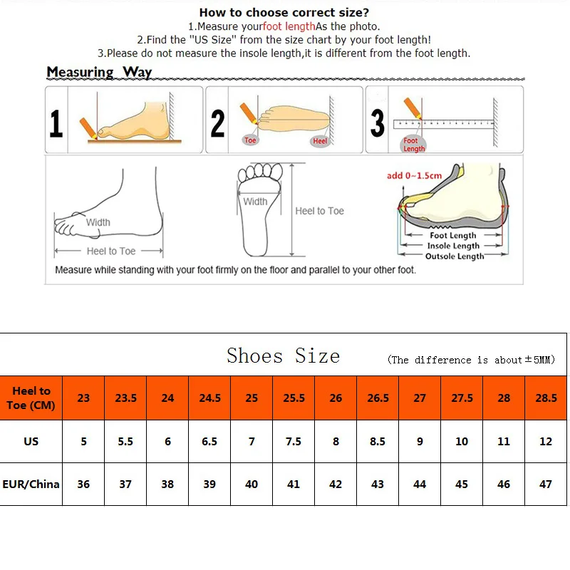 1.Measurements are the maximum size,please allow error about ± 5MM.Compare the size chart with your feet length carefully before ordering.