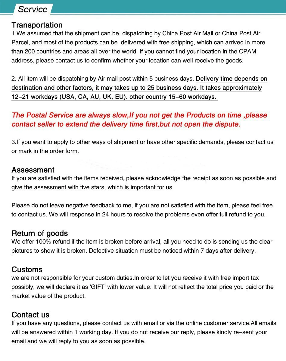 • If you did not receive the product within the guaranteed time( 45 days not including 2-5 day processing) you can request a refund or a reshipment.