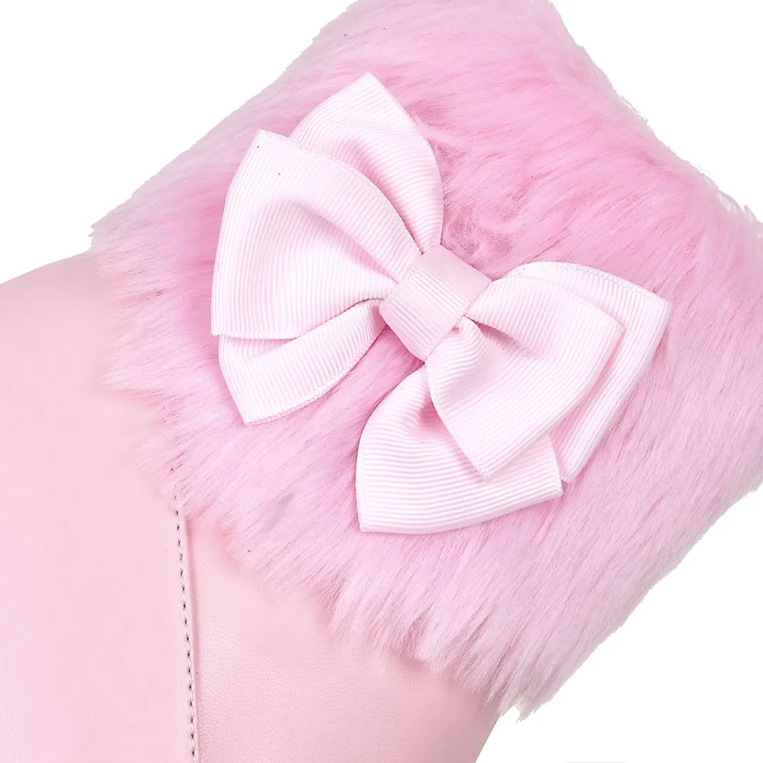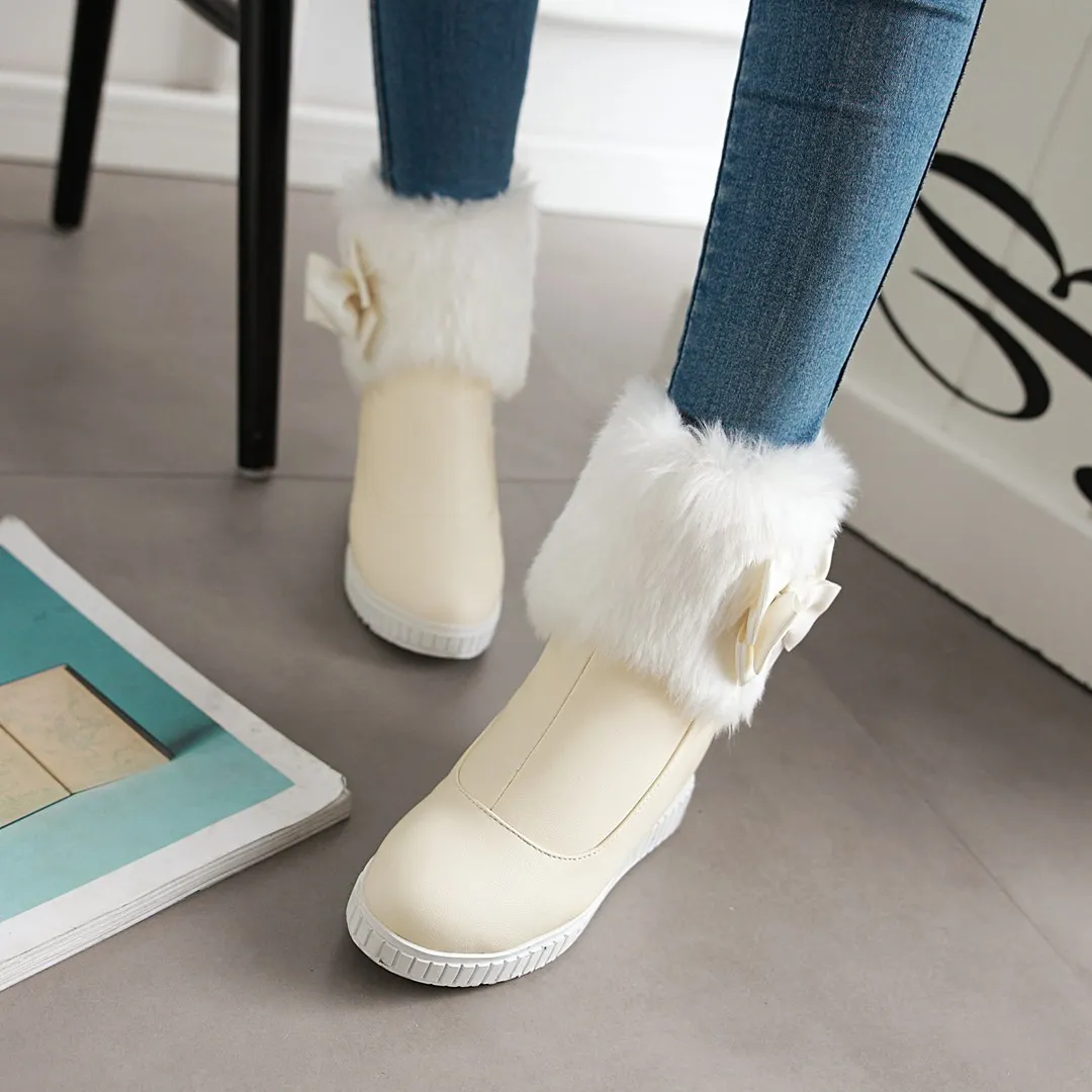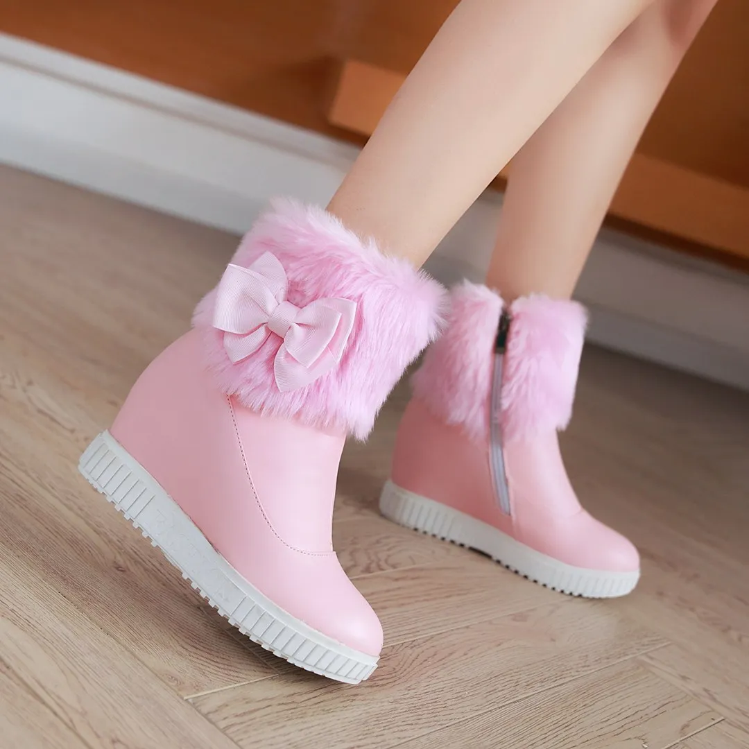 Internally Increased Exposed Fleece TPR Winter Warm Women’s Boots Bow Pink Thick Bottom Plush Snow Boots Mid-Calf Solid Faux Fur