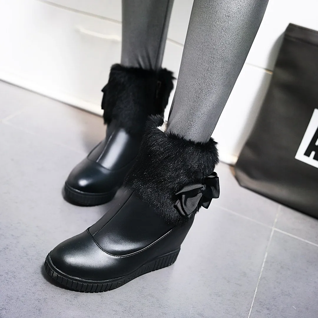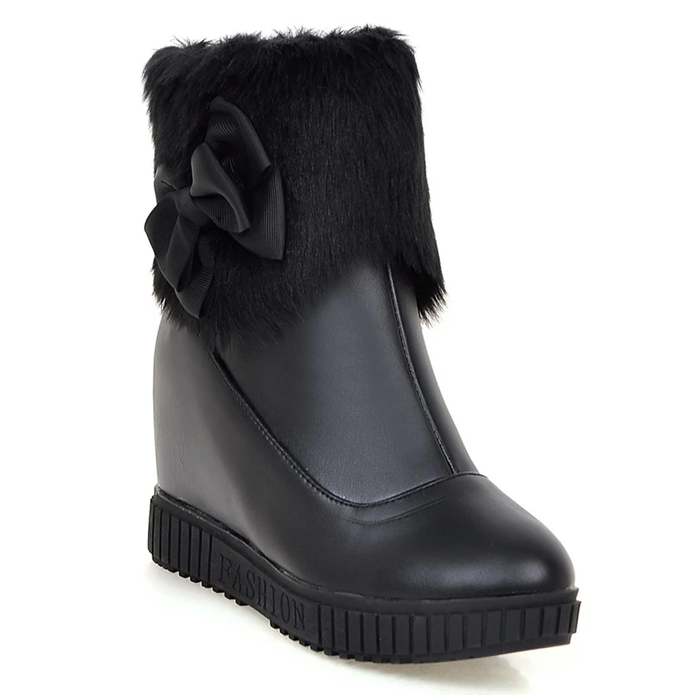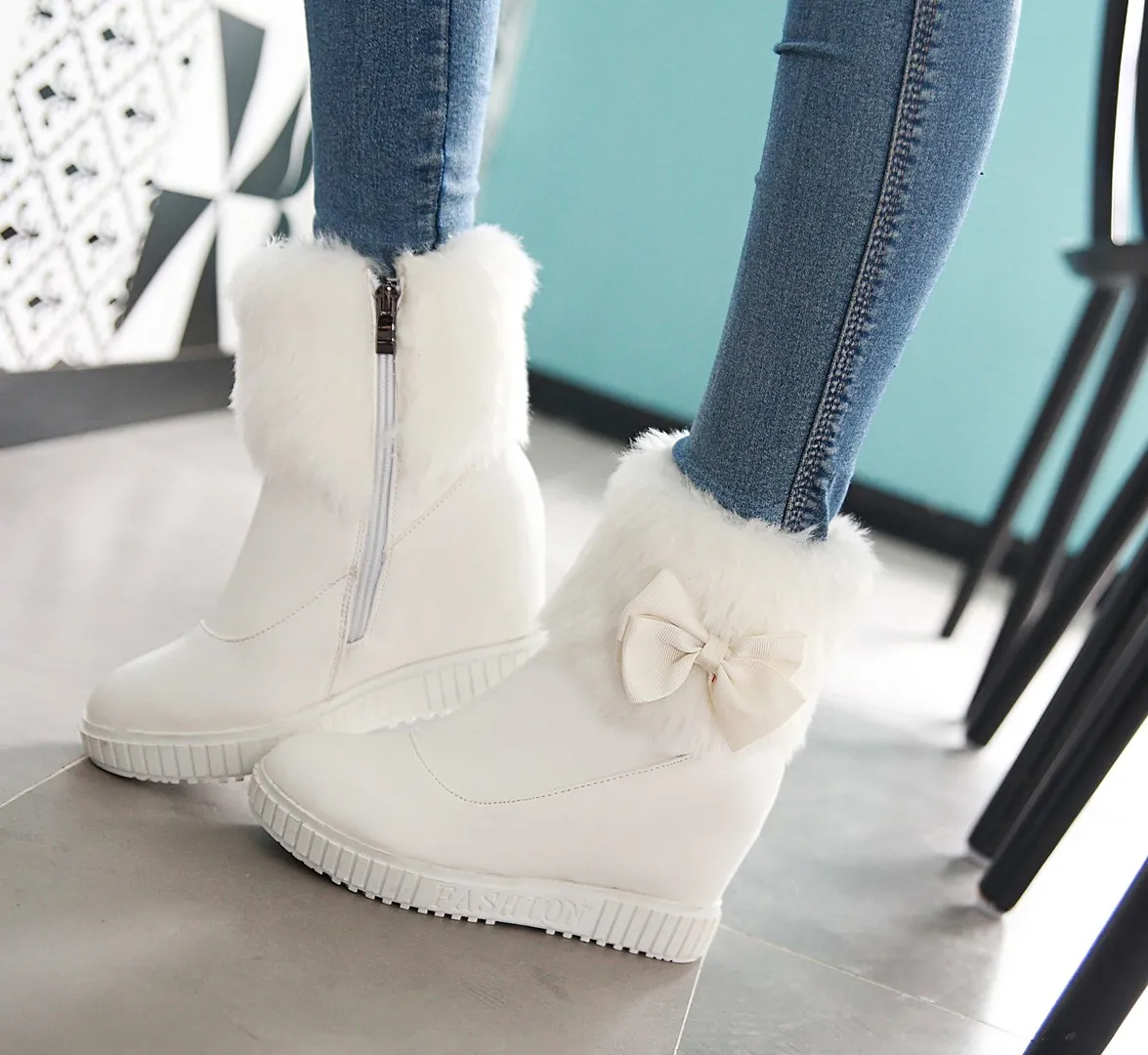Internally Increased Exposed Fleece TPR Winter Warm Women’s Boots Bow Pink Thick Bottom Plush Snow Boots Mid-Calf Solid Faux Fur