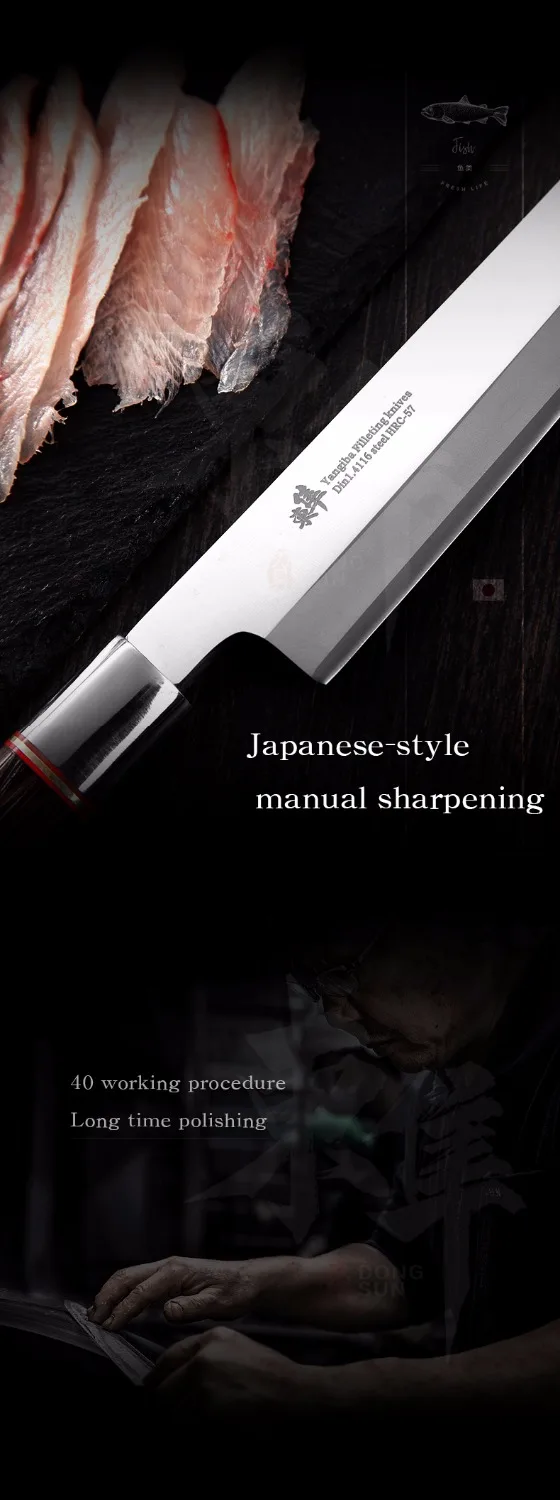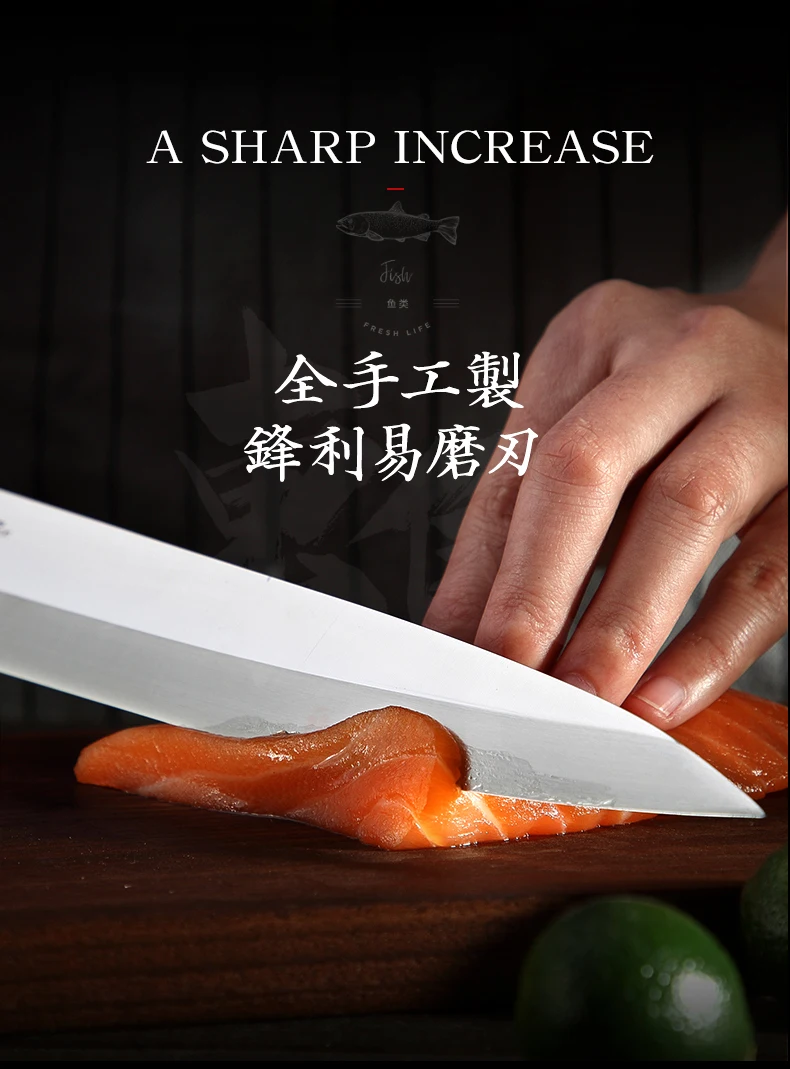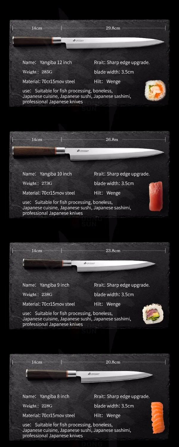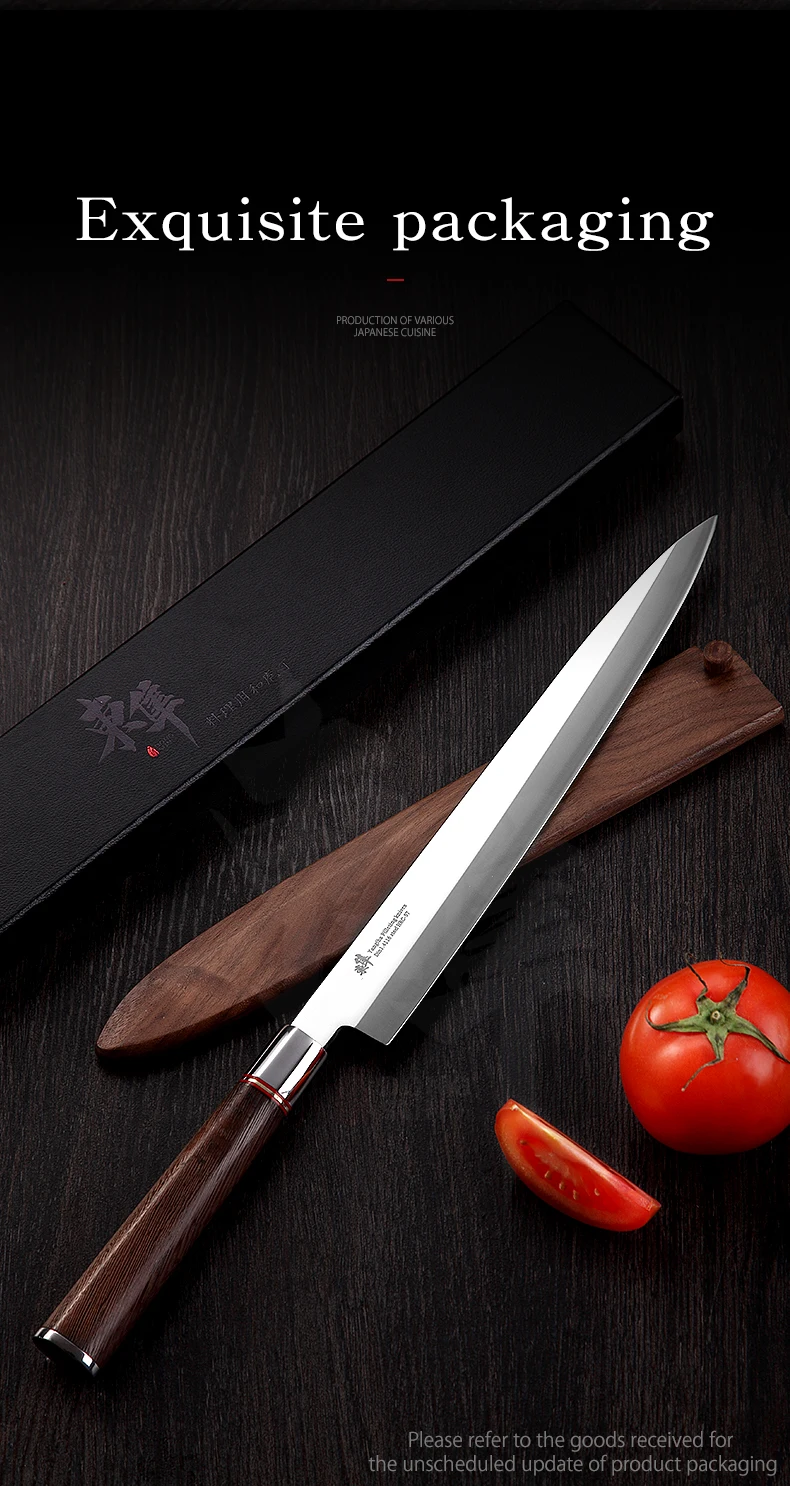 The new Yanagiba Filleting Knives is being updated, some models are being updated alternately, the new model steel 70Cr15Mov, carbon content 0.7%, the tool hardness is more stable, the sharpness is more durable, we guarantee that every customer will receive the latest models and our company has not used commodity.