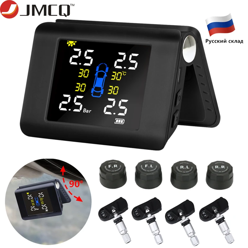 JMCQ TPMS Solar Power Tyre Pressure Monitoring System with 4 Sensors LCD Real-time Display Car Tire Pressure Auto Alarm System
