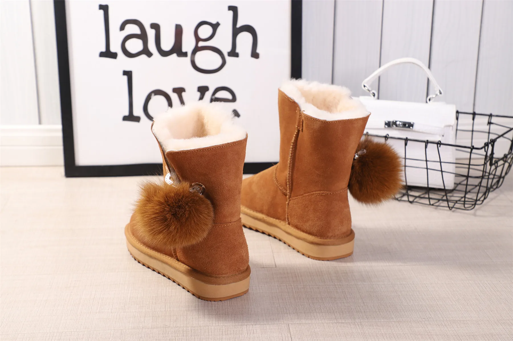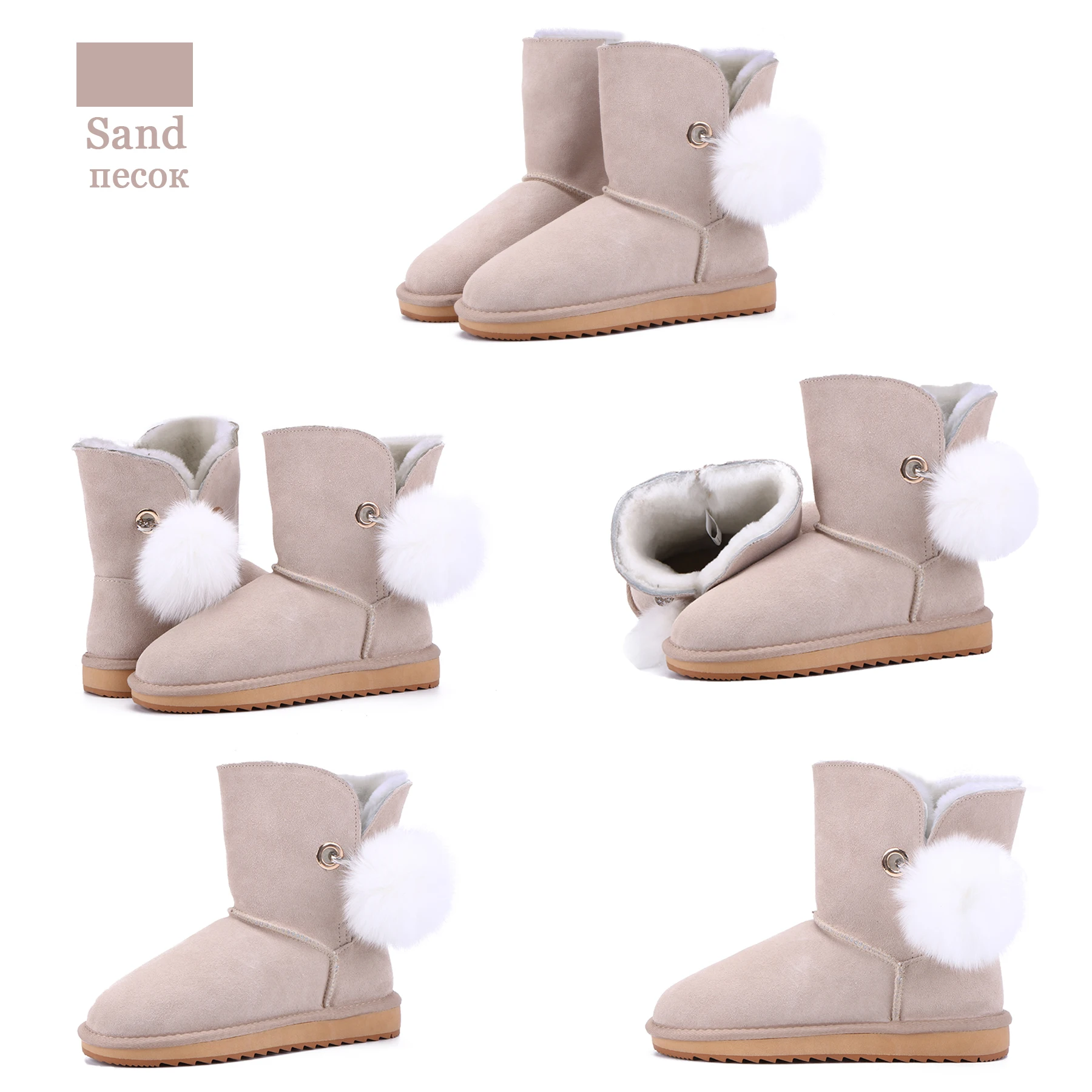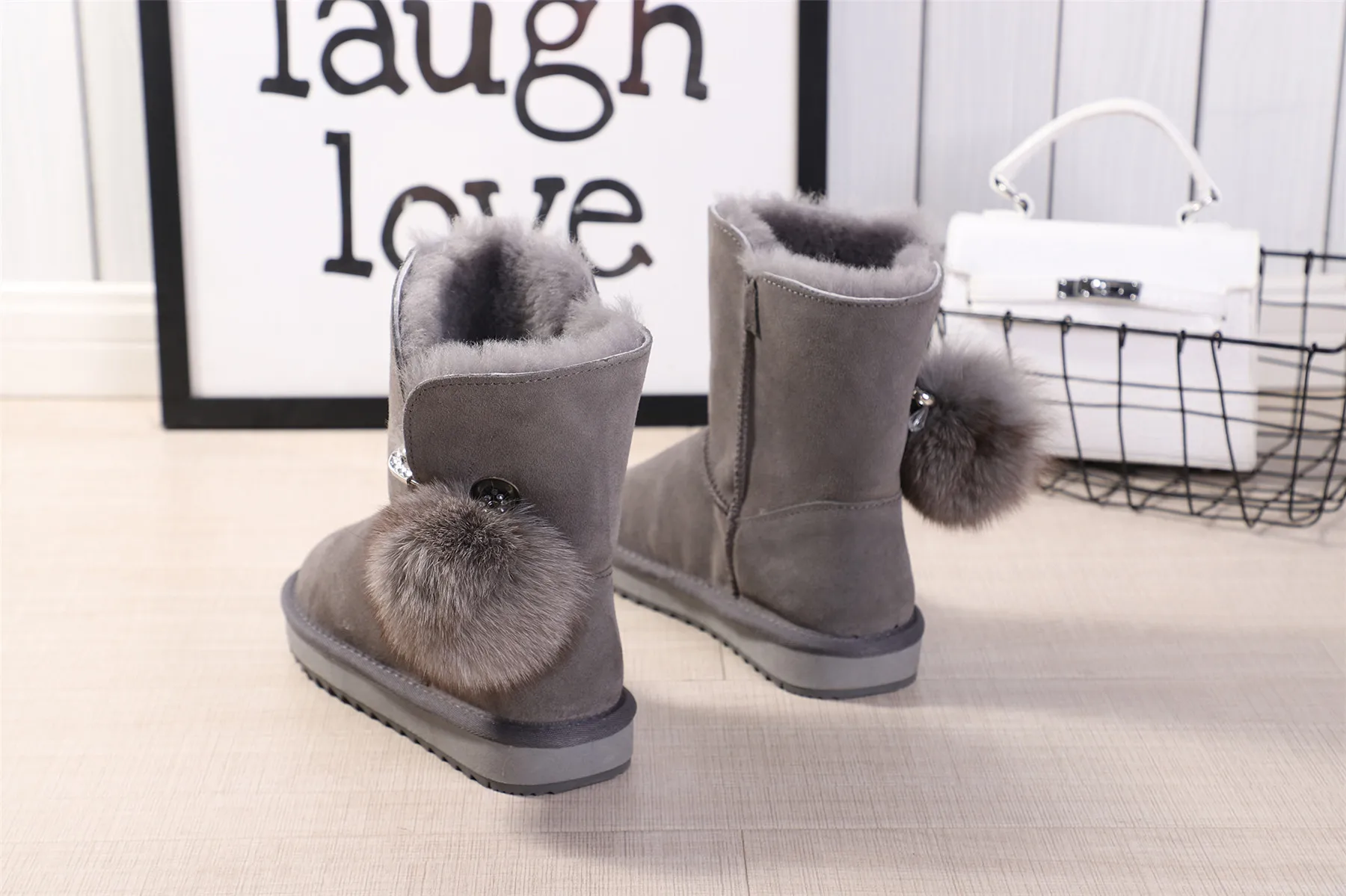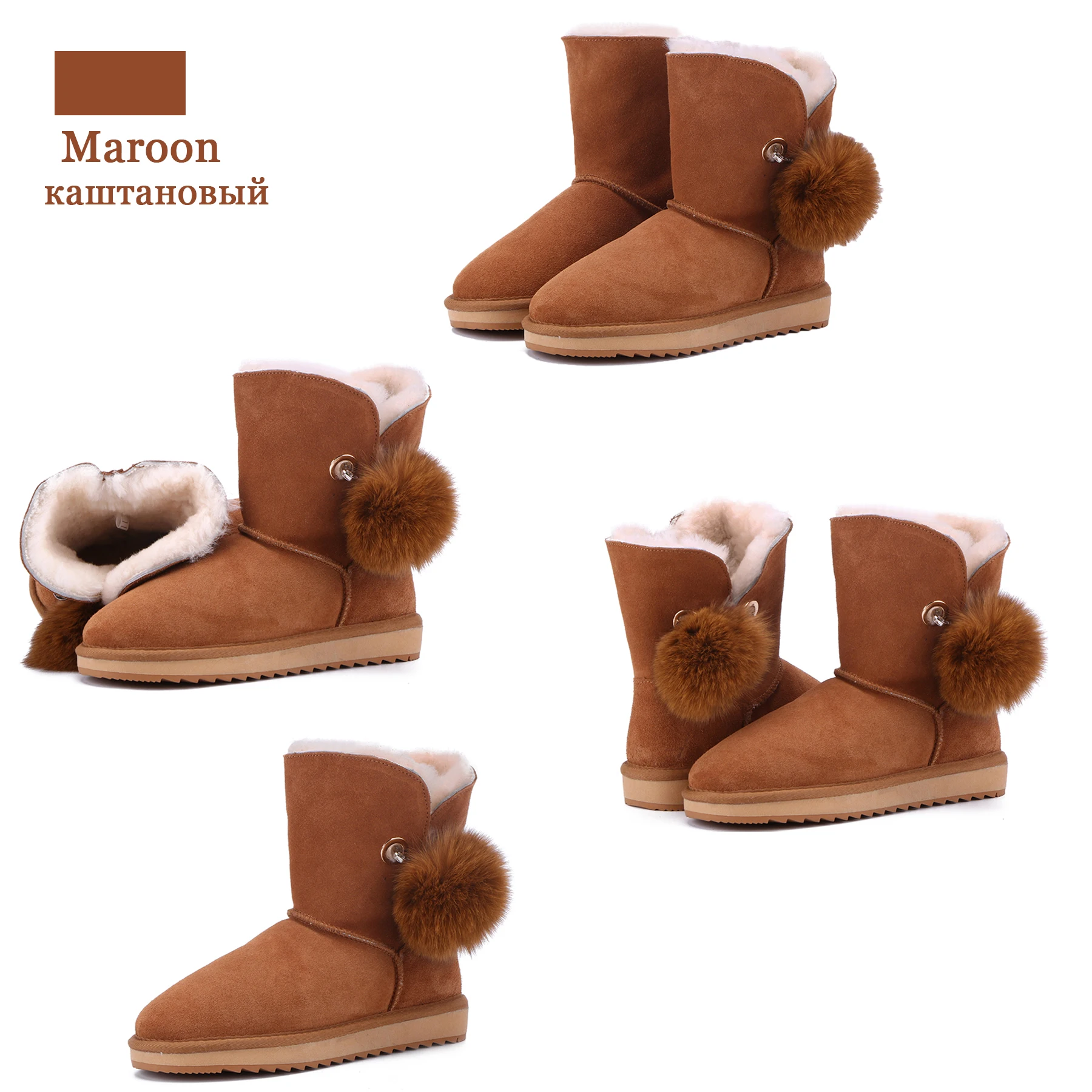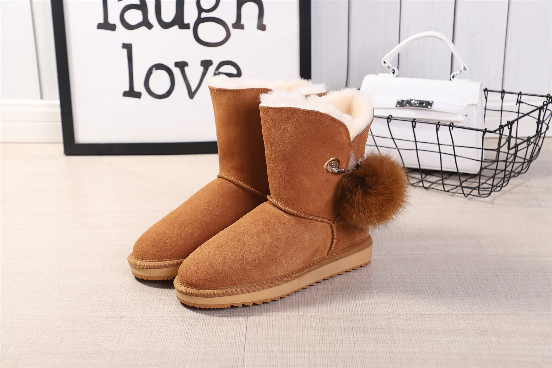 JXANG 2020 High Quality Crystal Pom-pom Brooch Women Winter Shoes Fox Fur Ball Sheepskin Suede Leather Lined Women Snow Boots