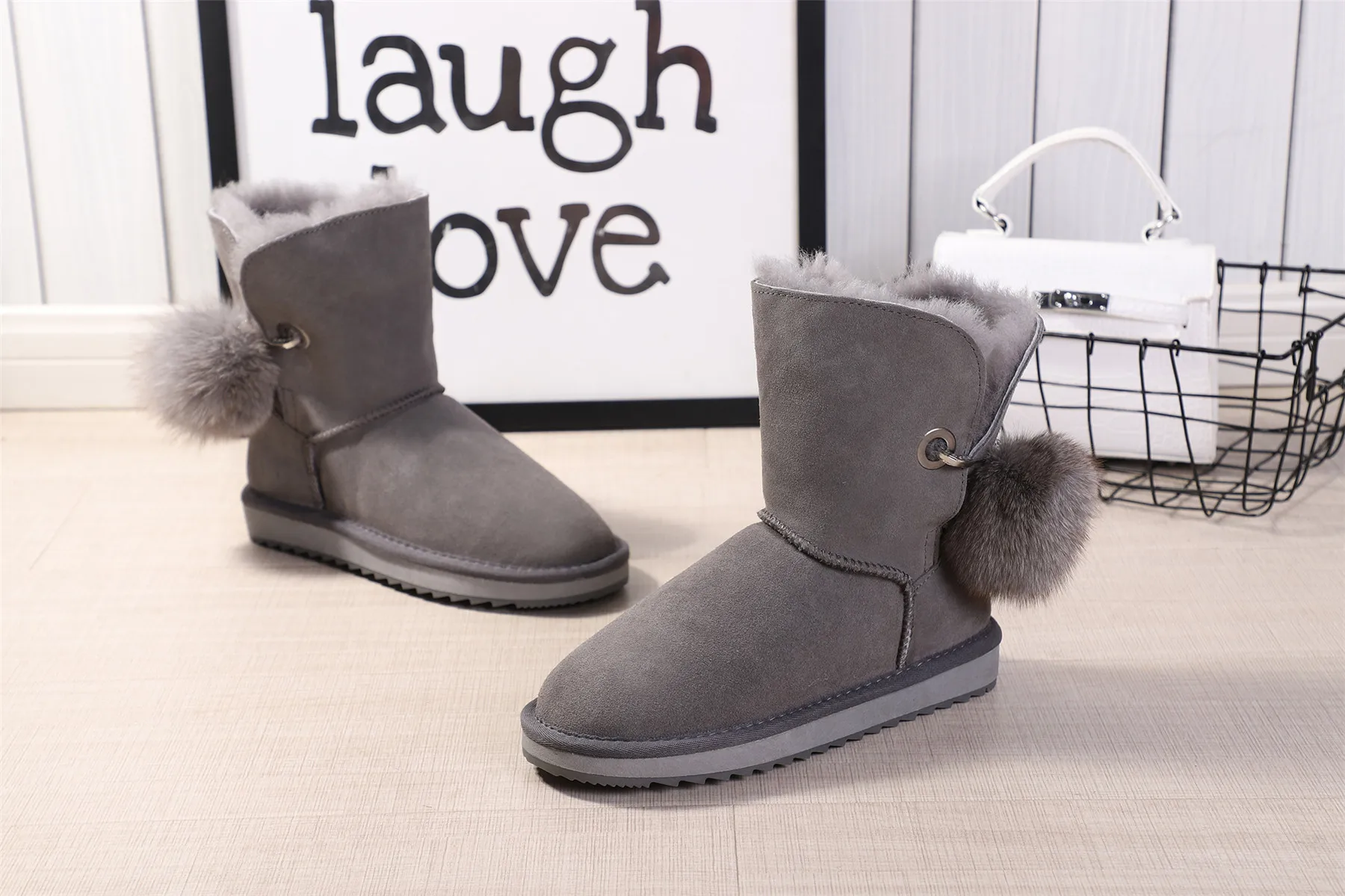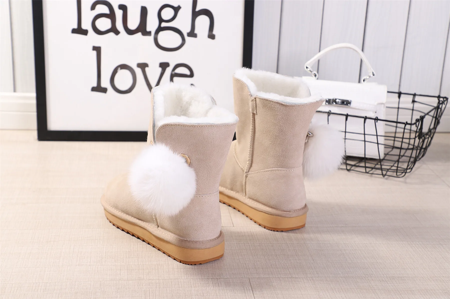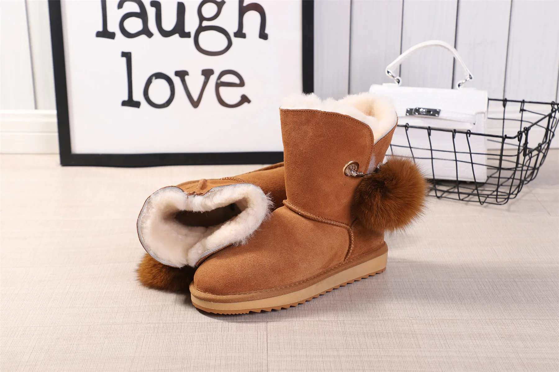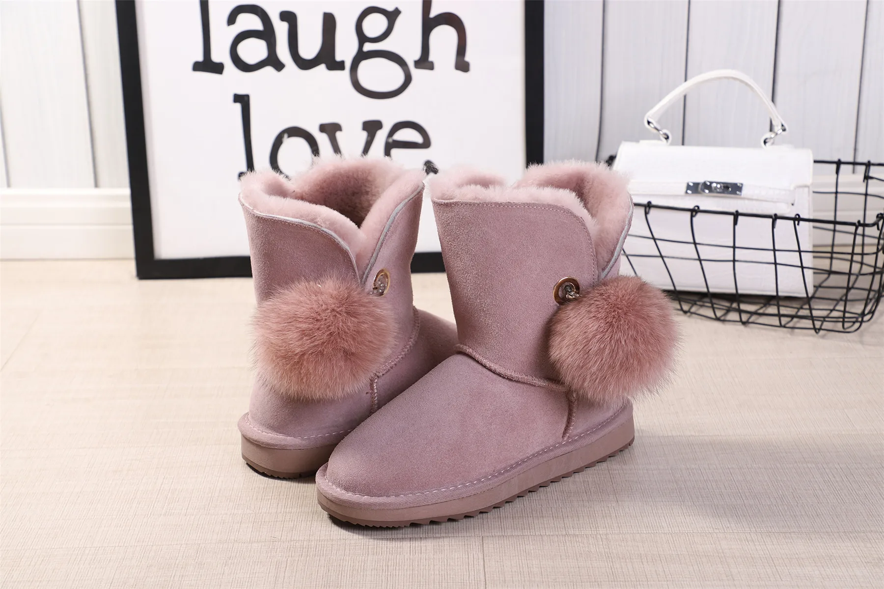 JXANG 2020 High Quality Crystal Pom-pom Brooch Women Winter Shoes Fox Fur Ball Sheepskin Suede Leather Lined Women Snow Boots