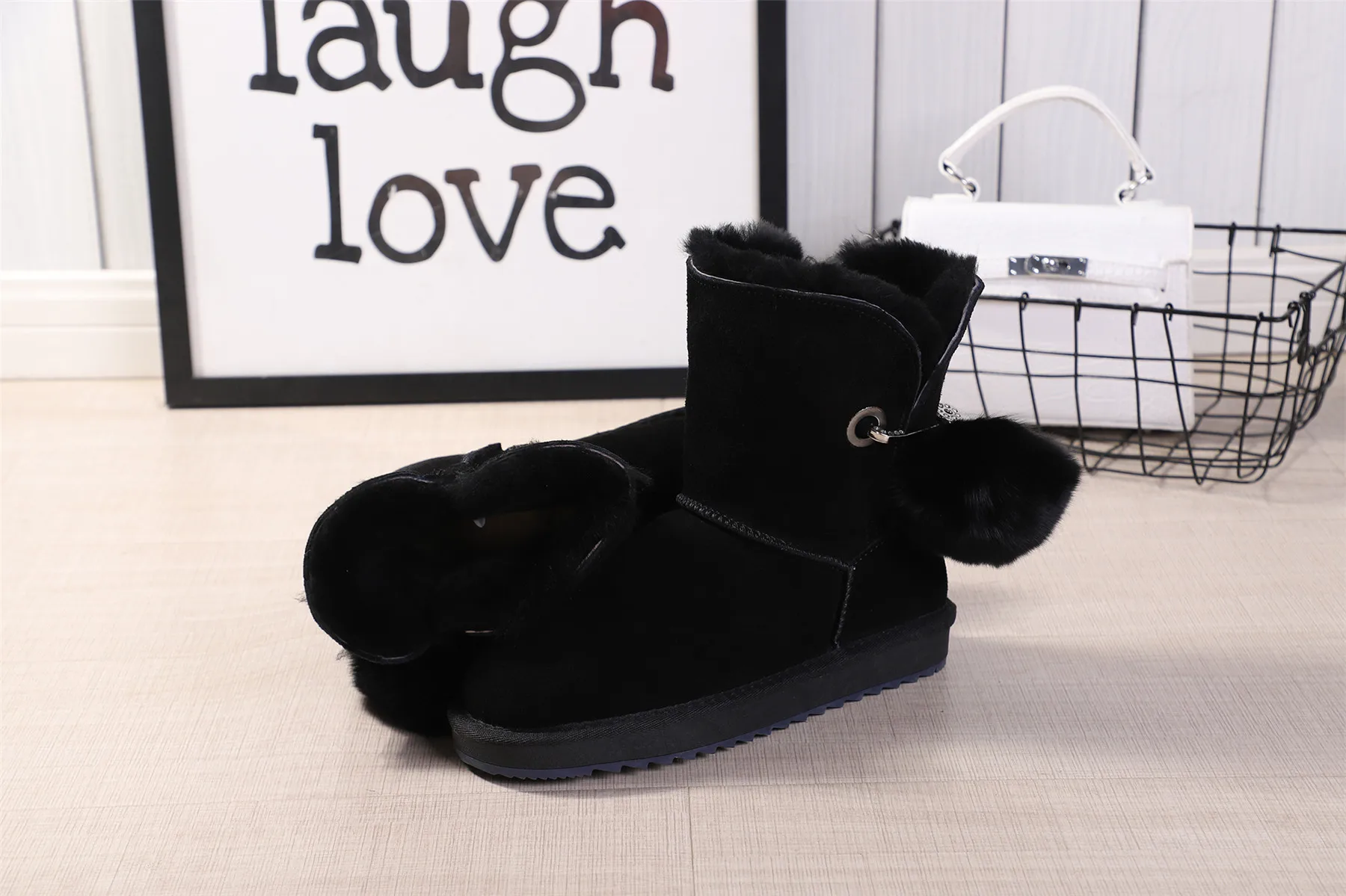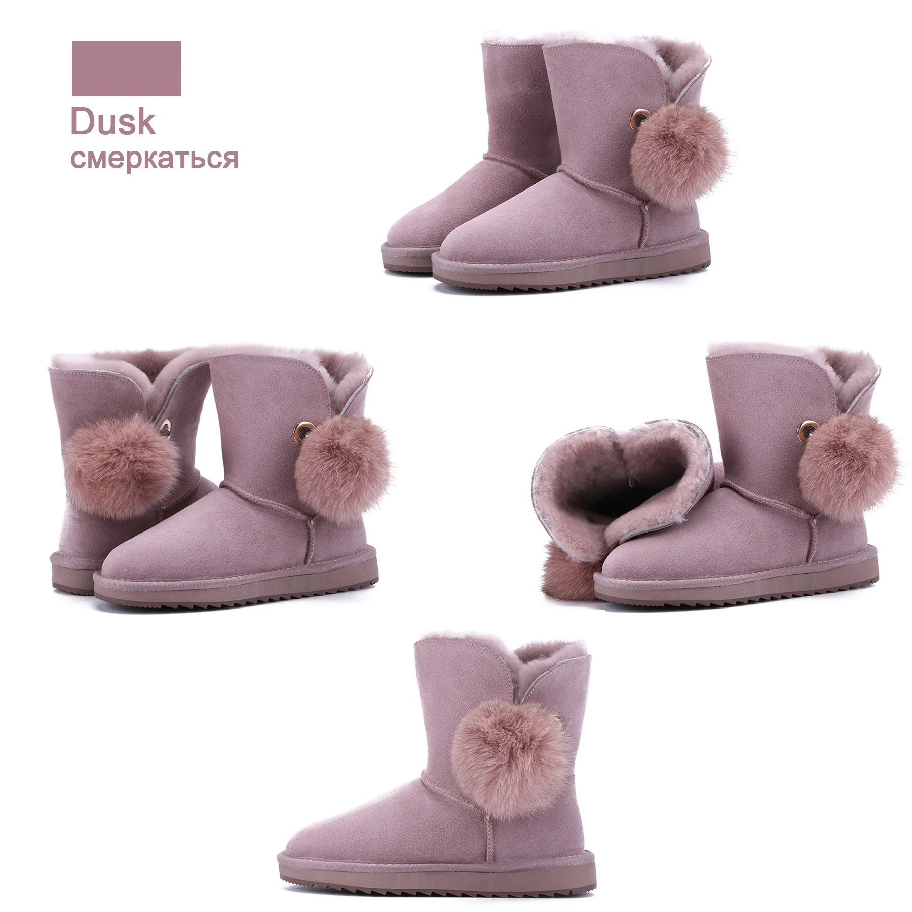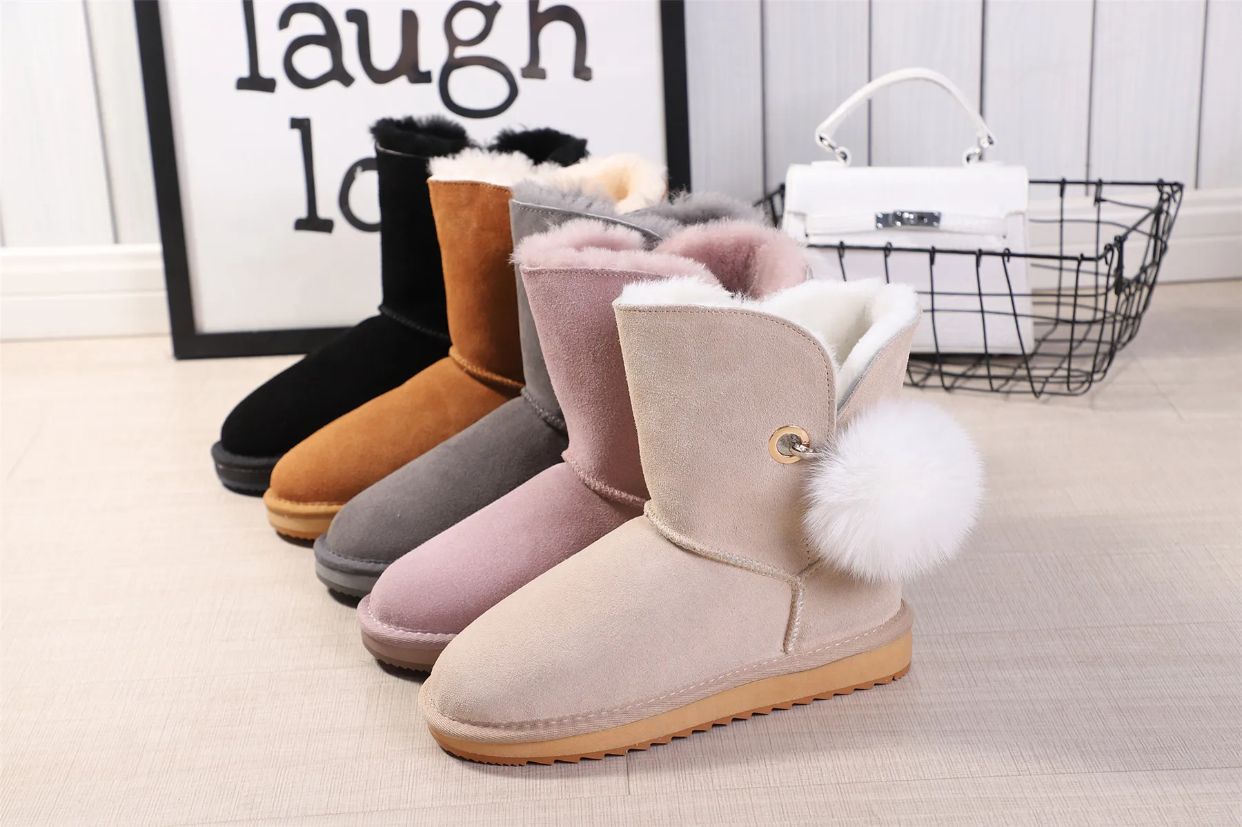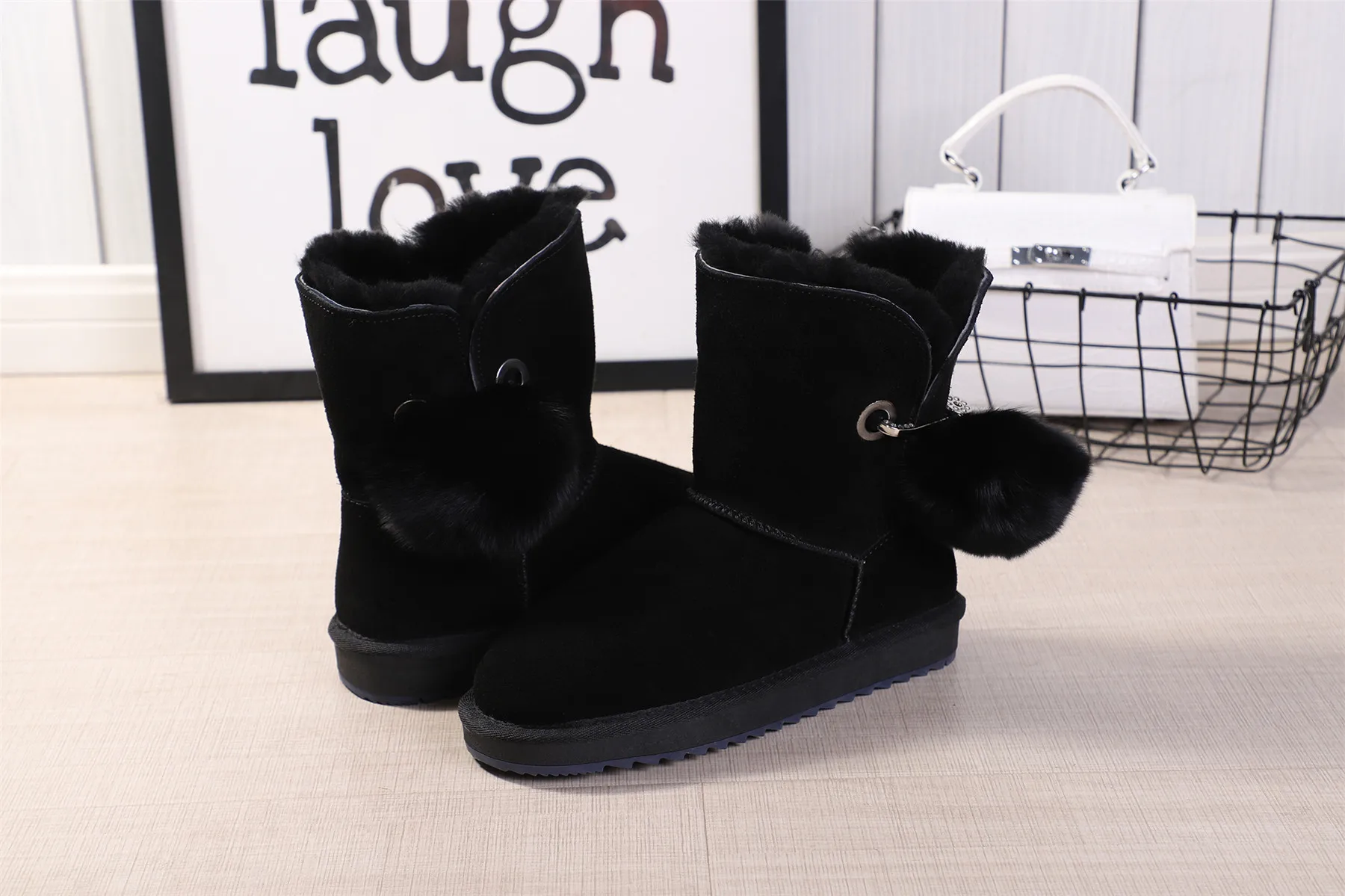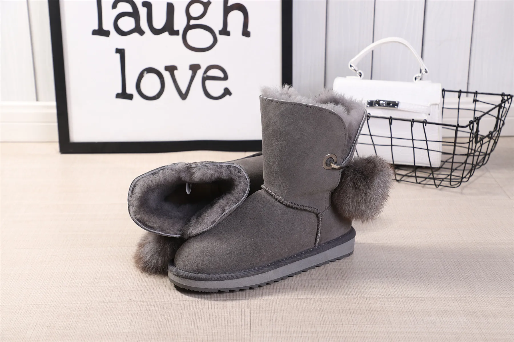 JXANG 2020 High Quality Crystal Pom-pom Brooch Women Winter Shoes Fox Fur Ball Sheepskin Suede Leather Lined Women Snow Boots