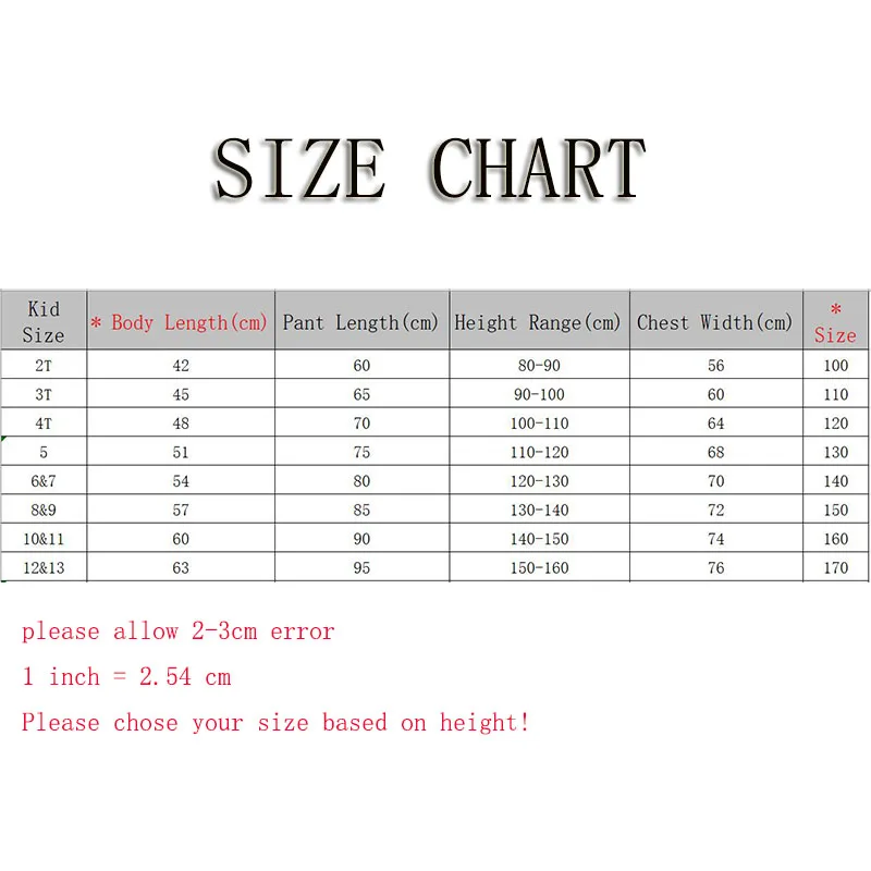 Size2T(100):Clothes length:42cm,bust:56cm, shoulder: 26cm,pants length:60cm,Recommend height: 80-90cm