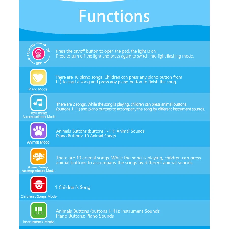 Full-Screen design,Colorful toy pad with many functions of Animal Congition,Piano Playing,Songs Playing and so on
