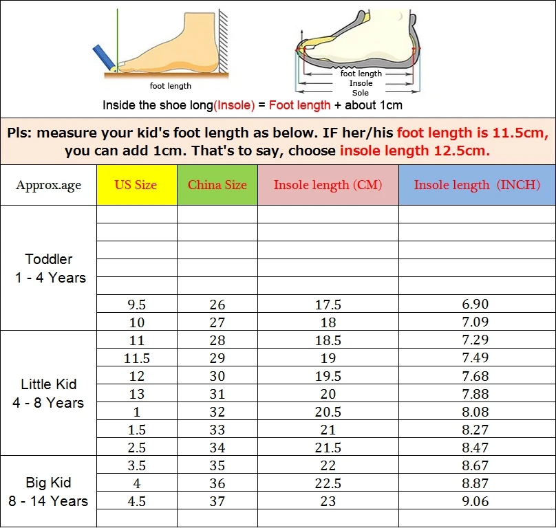 5. With regard to size, measure kids foot length cm or inch +1 cm or 0.03937 inch, select the corresponding us size, thanks