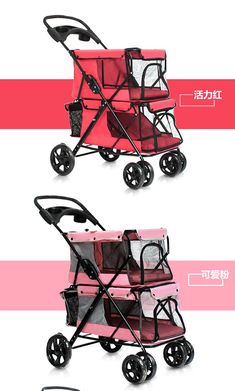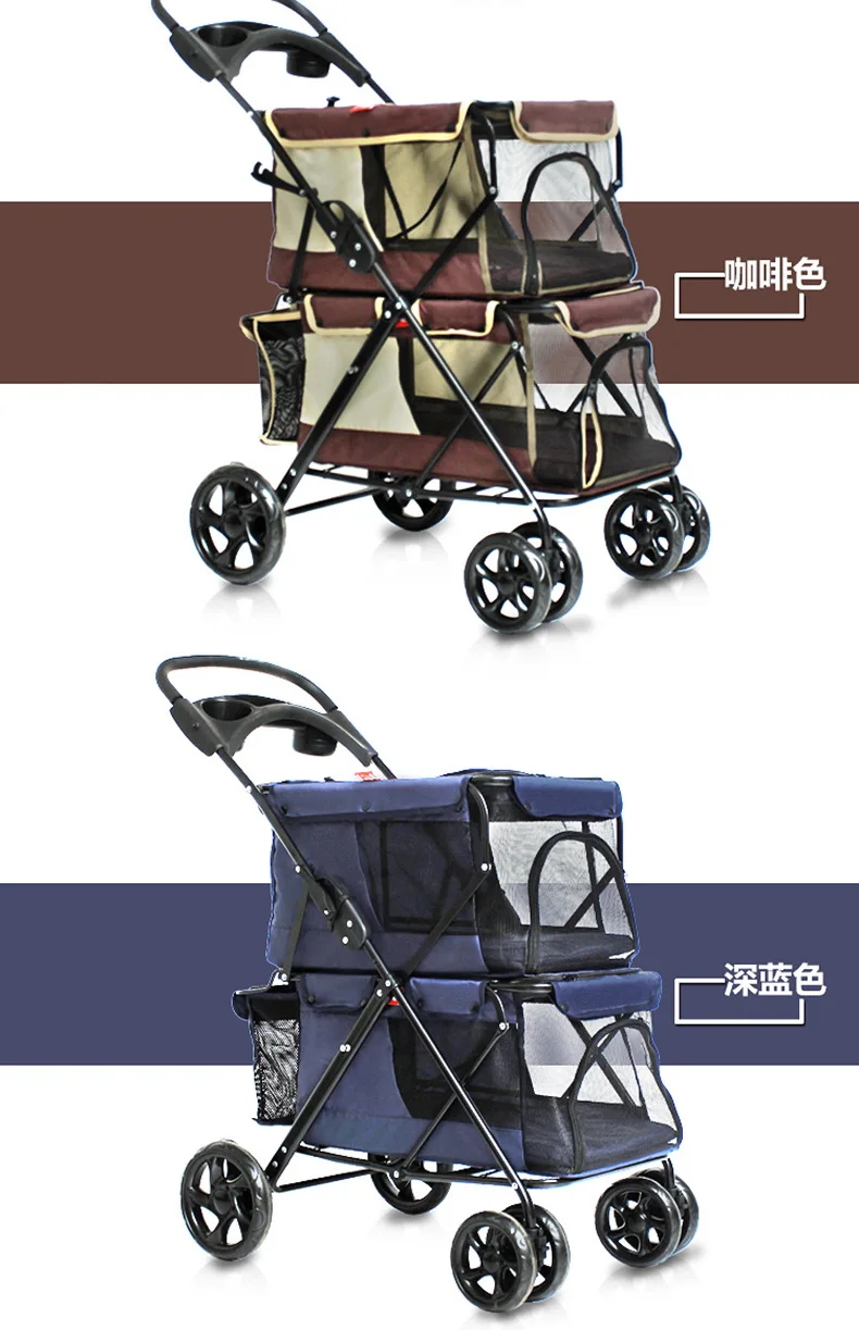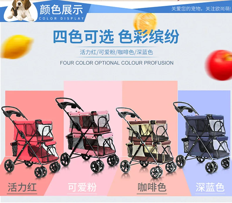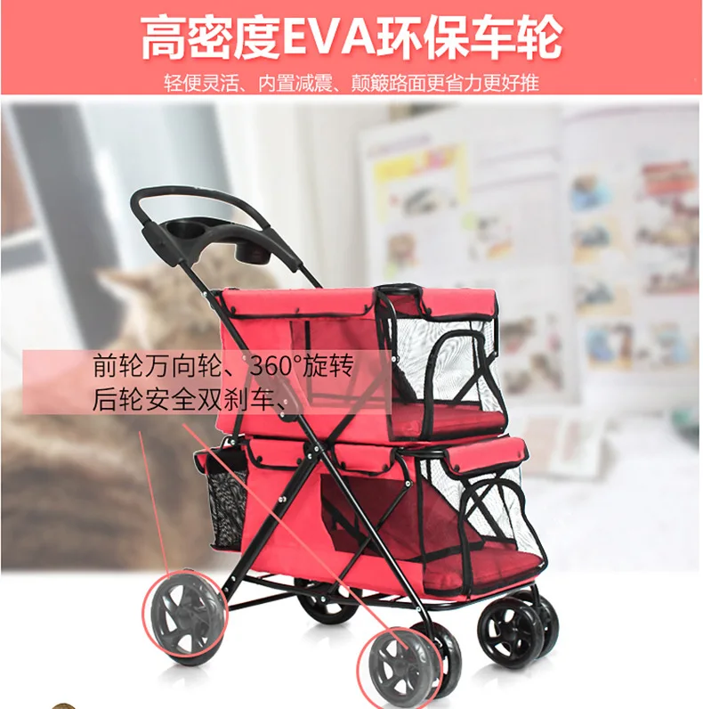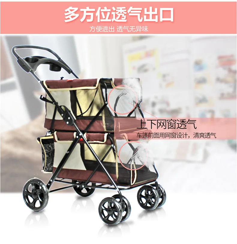 Light foldable double pet stroller dog big space trolley cage four round outdoor travel
