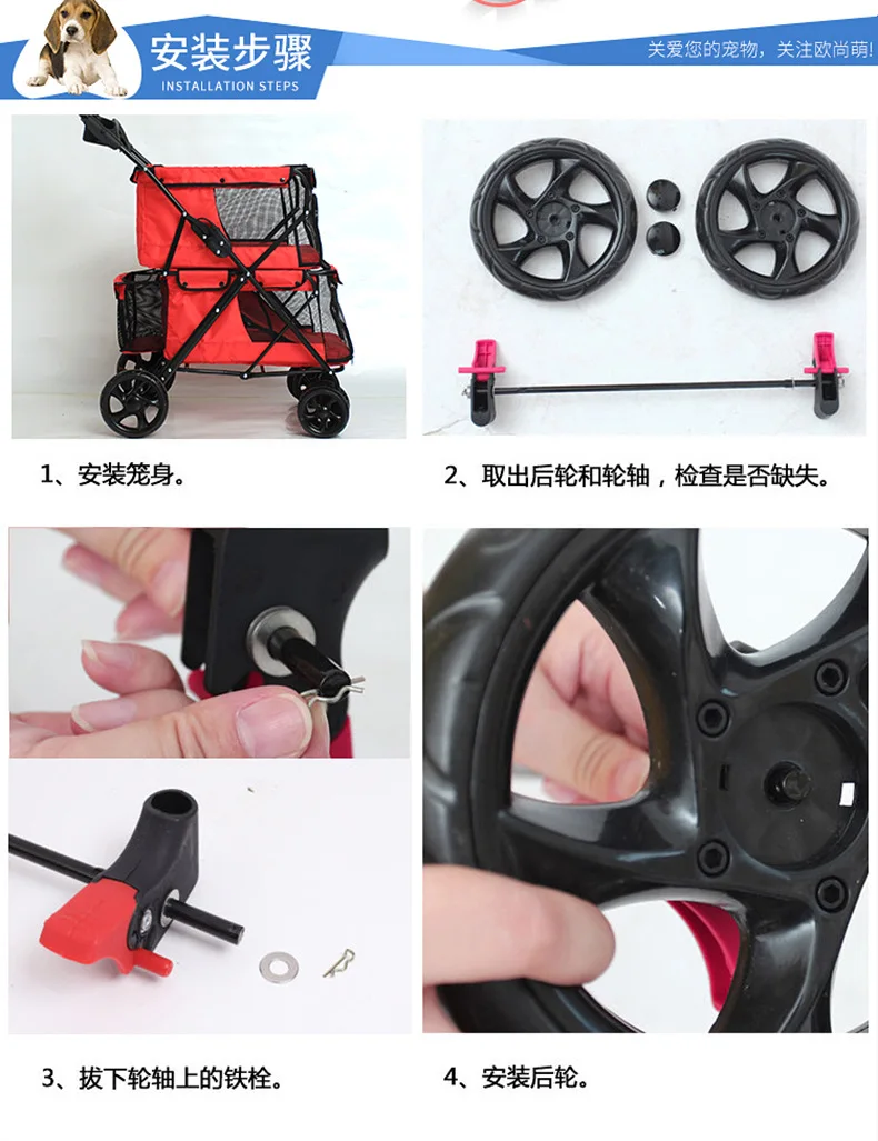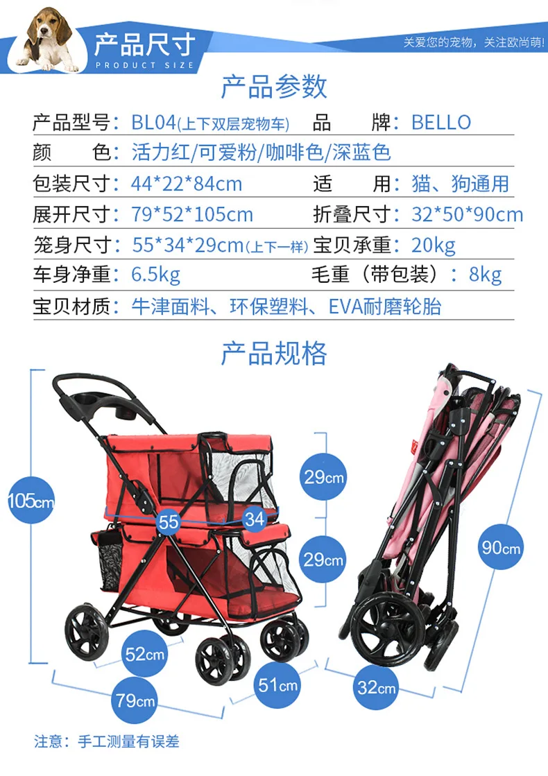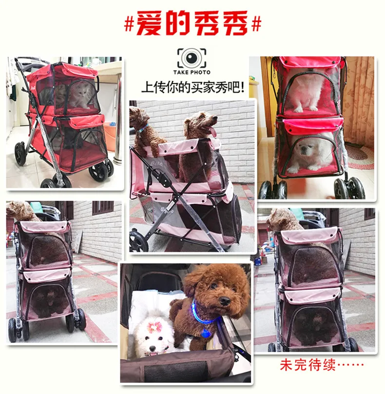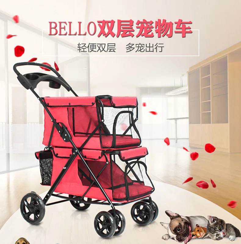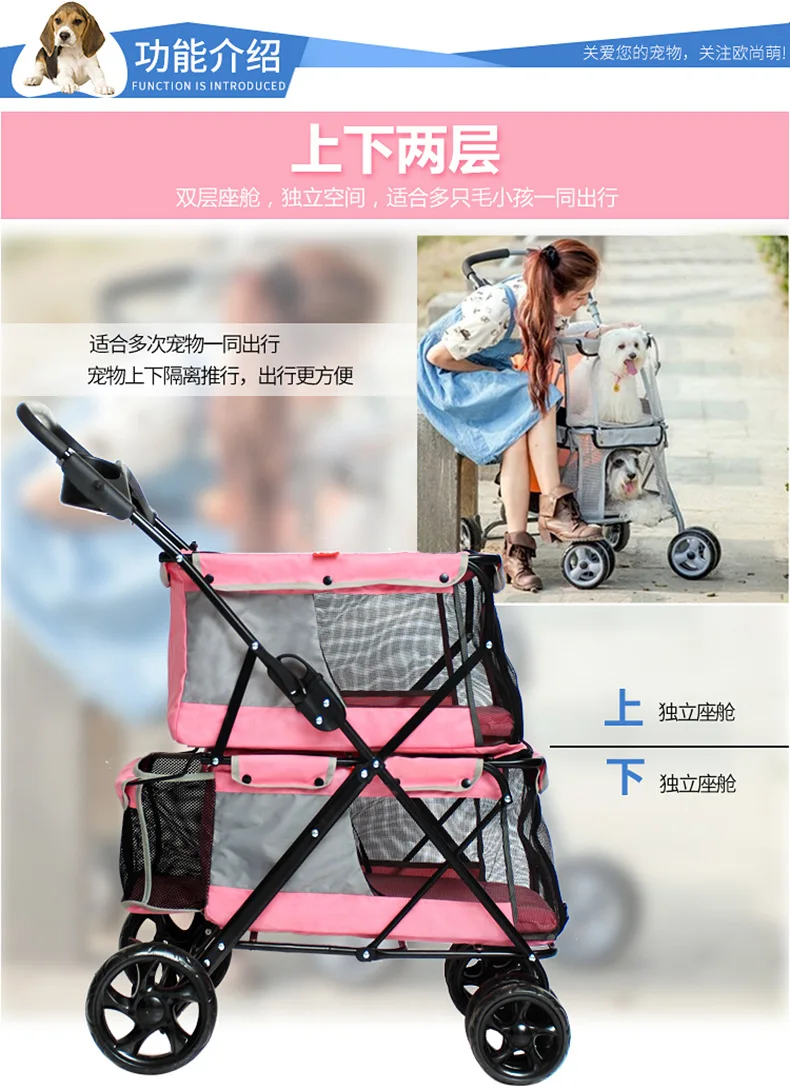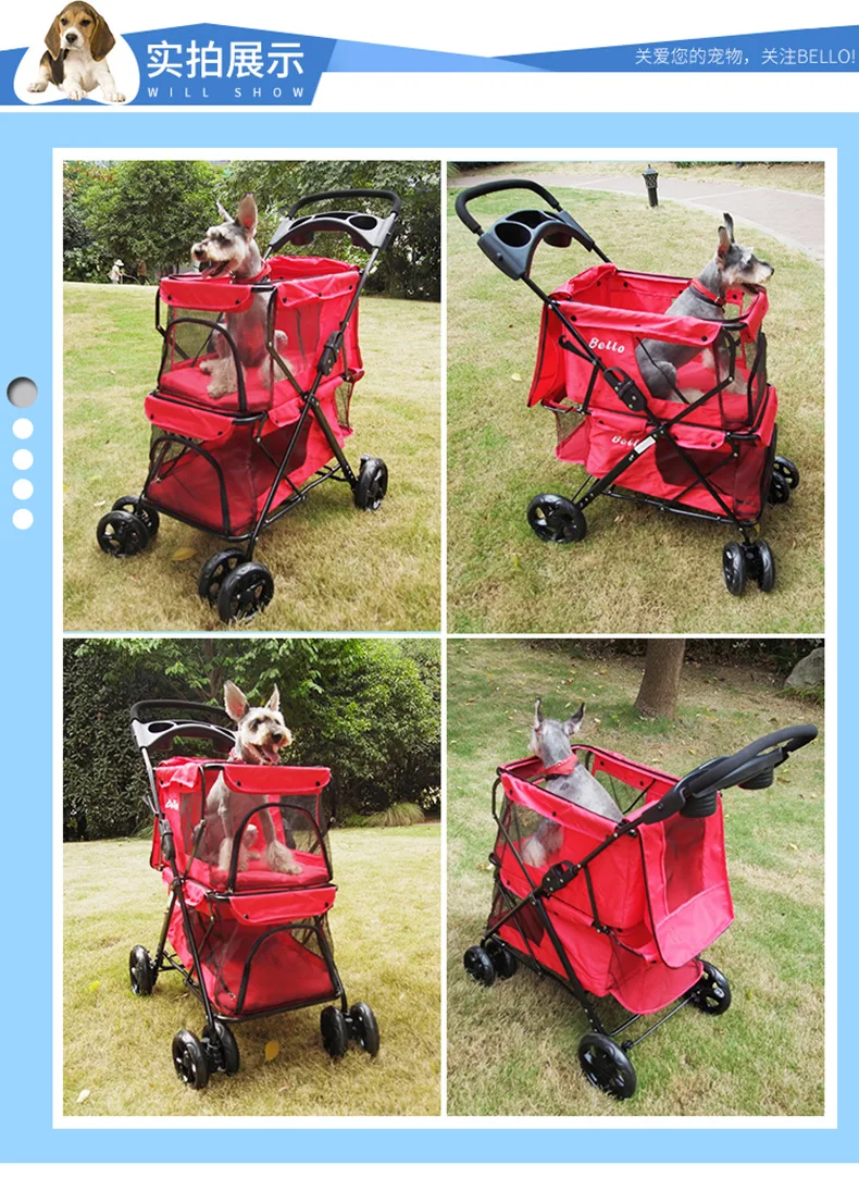 Light foldable double pet stroller dog big space trolley cage four round outdoor travel