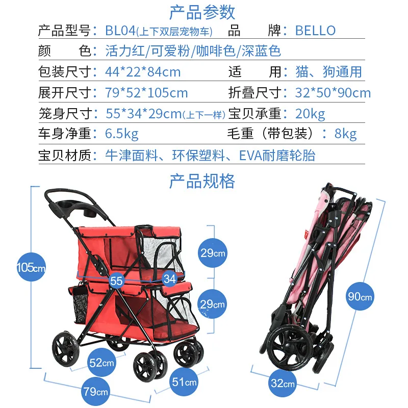 Light foldable double pet stroller dog big space trolley cage four round outdoor travel