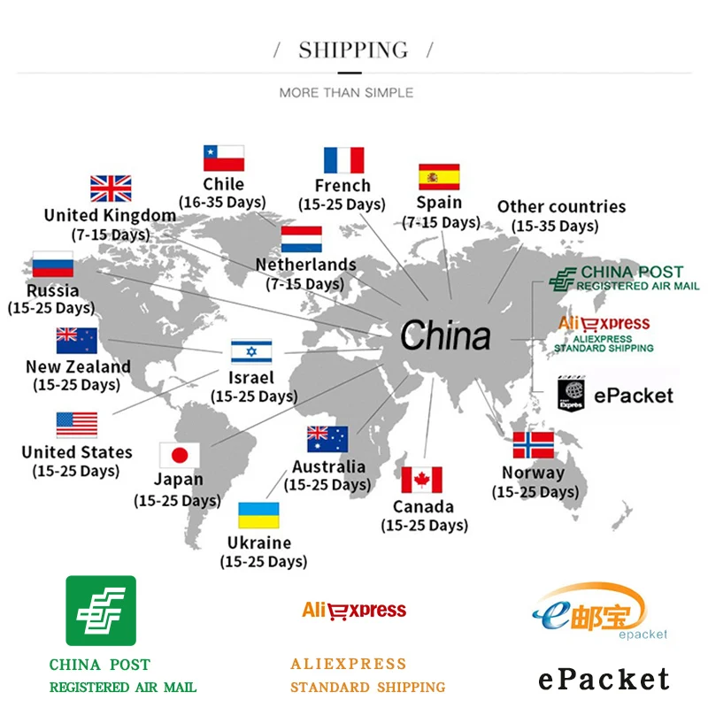 Packages from our warehouse in China will be shipped by ePacket or EMS depending on the weight and size of the product. Packages shipped from our US warehouse are shipped through USPS.