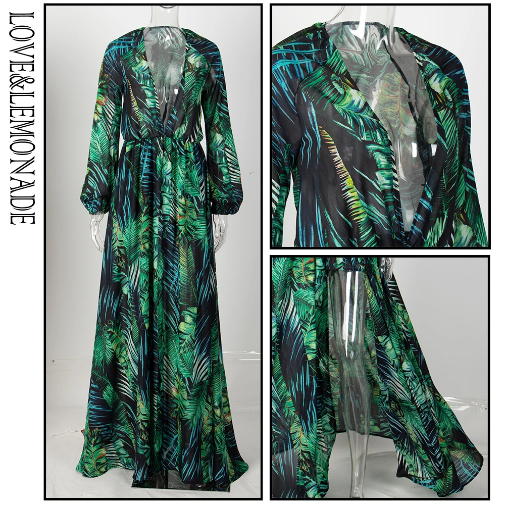 LOVE&LEMONADE Leaf Printing Deep V-Neck Chiffon Long-Sleeved Playsuit LM80428