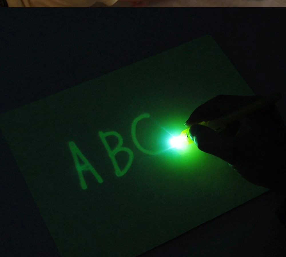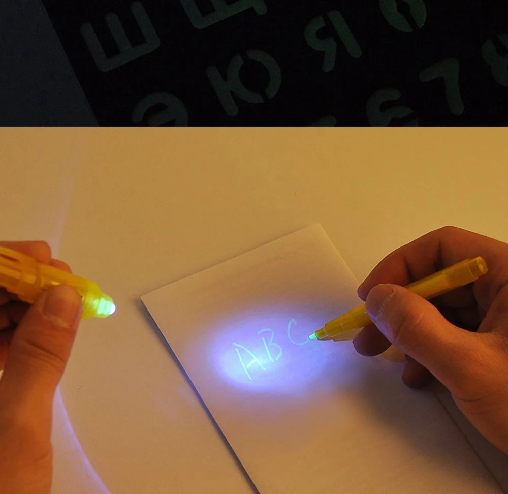3. At the other end of the marker is a pen with special ink that appears only under the light of the flashlight. It can not be drawn on a tablet – use plain paper for this!