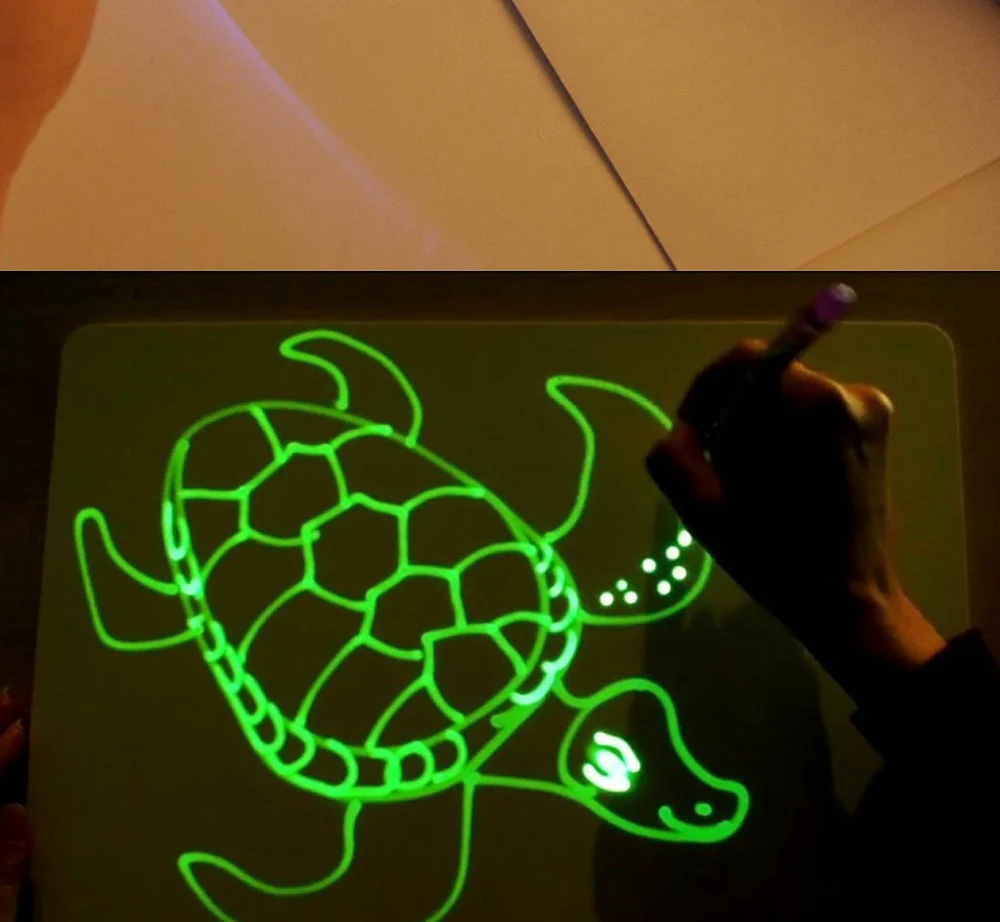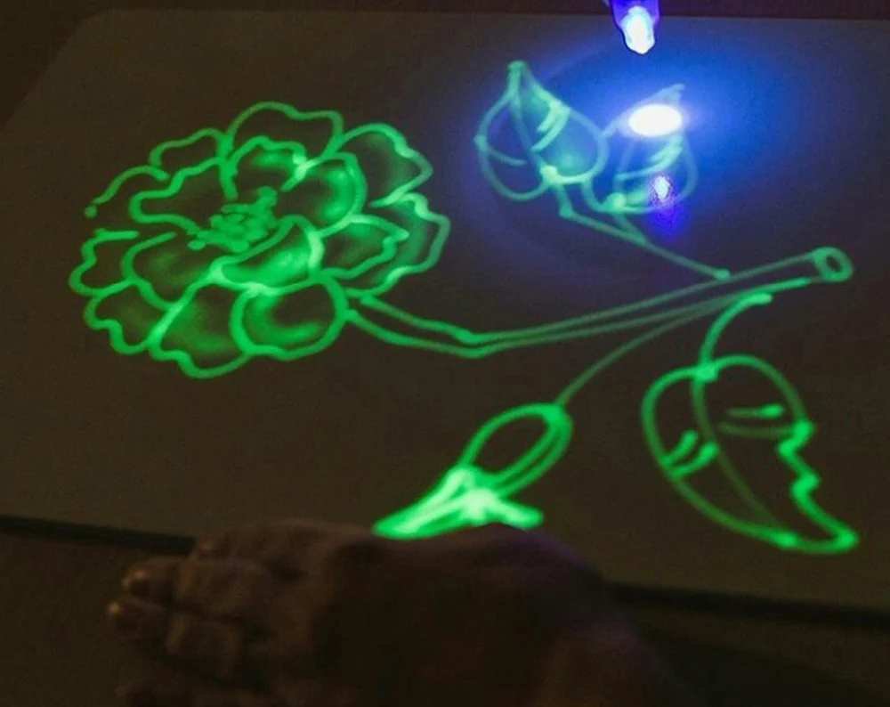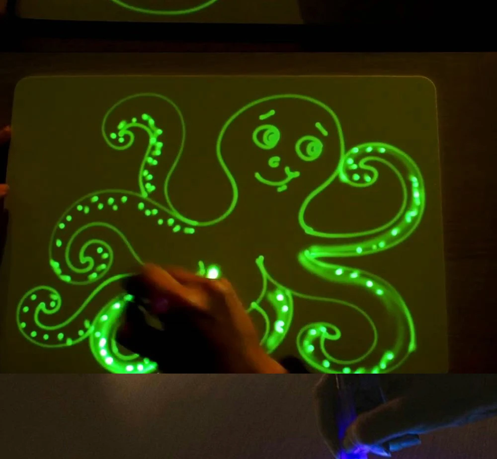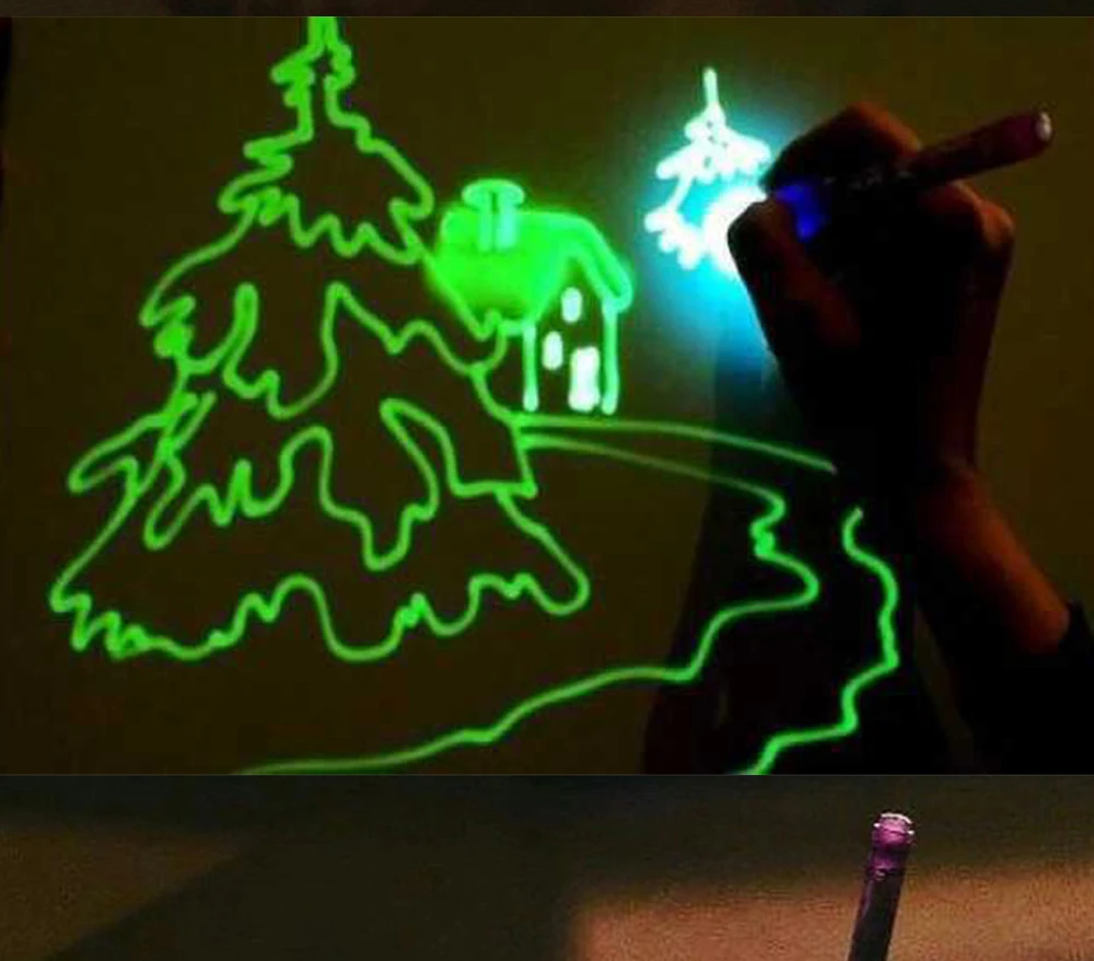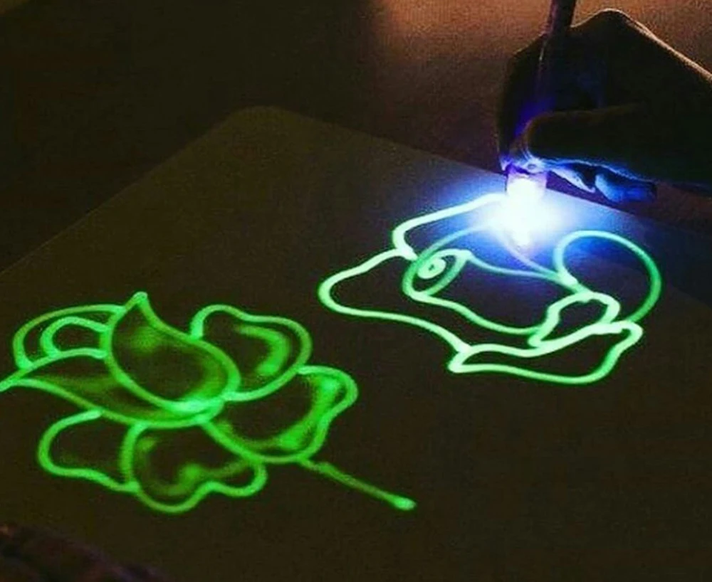2. Take a special tablet with a light-accumulating coating, a flashlight marker and start drawing! From the touch of the “brush” to the “canvas” there will be light lines, the brightness and clarity of which depends on the distance from the marker to the tablet and the angle of inclination. You can not erase from the work surface, but you can draw on top, since each new line will be brighter than the previous one. Completely the same picture disappears itself in 30-40 minutes.