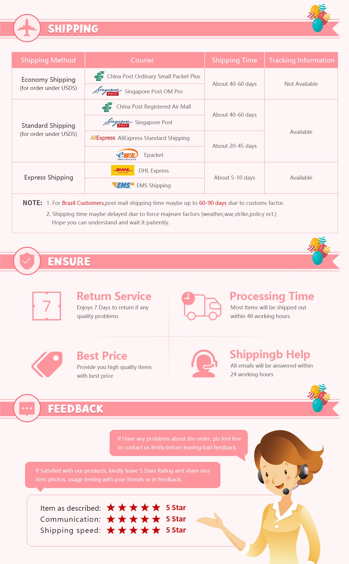 Packages from our warehouse in China will be shipped by ePacket or EMS depending on the weight and size of the product. Packages shipped from our US warehouse are shipped through USPS.