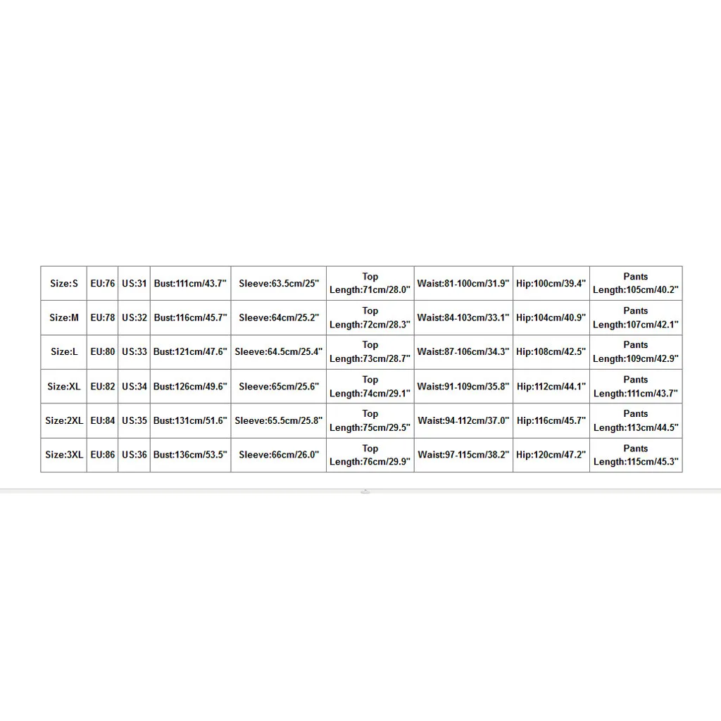 | Size | EU | US | Bust | Sleeve | Top Length | Waist | Hip | Pants Length |