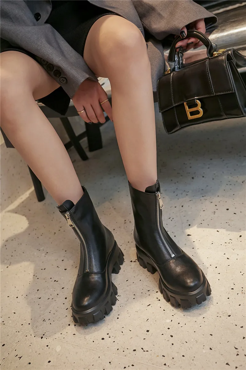 Meotina Motorcycle Boots Women Shoes Real Leather Platform High Heel Mid-Calf Boots Zip Block Heels Lady Boots Autumn Winter 40