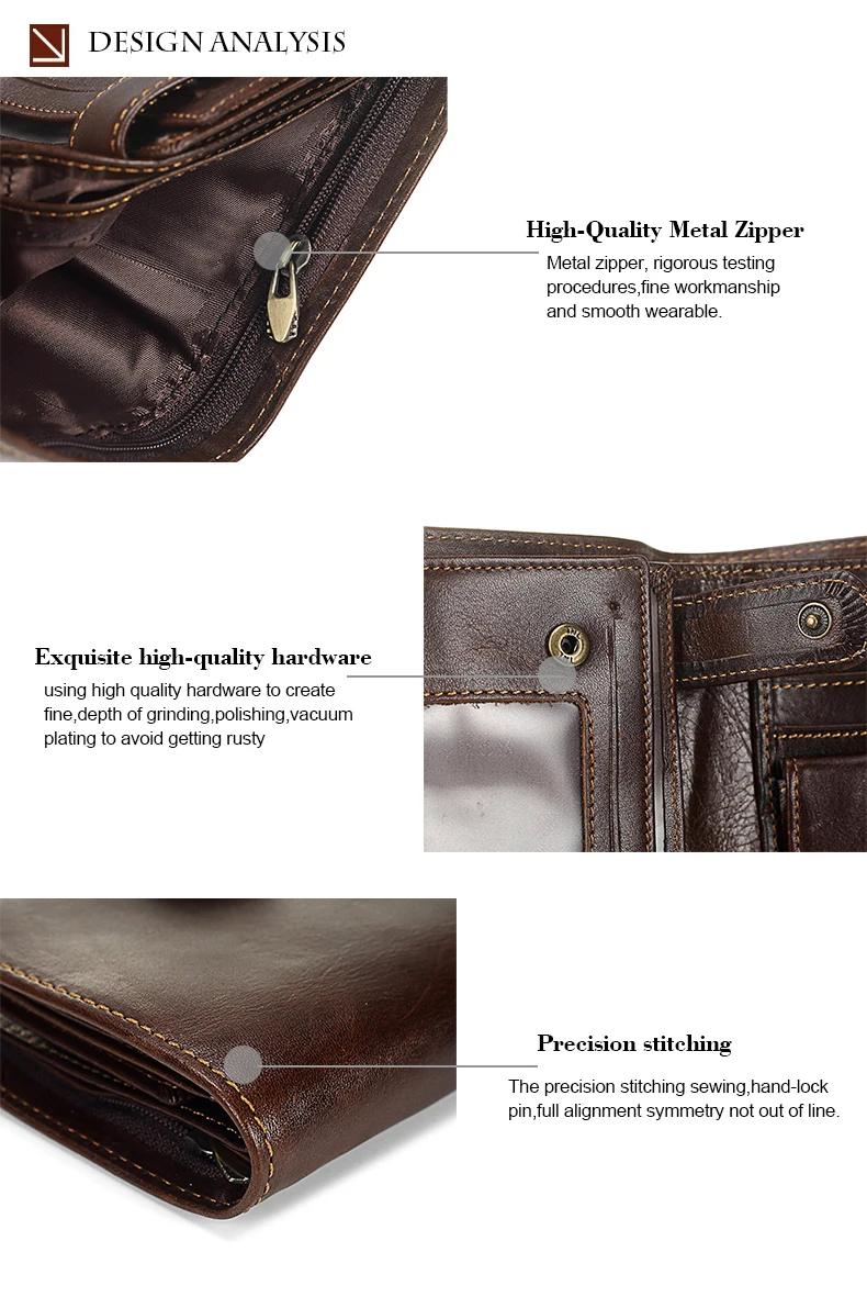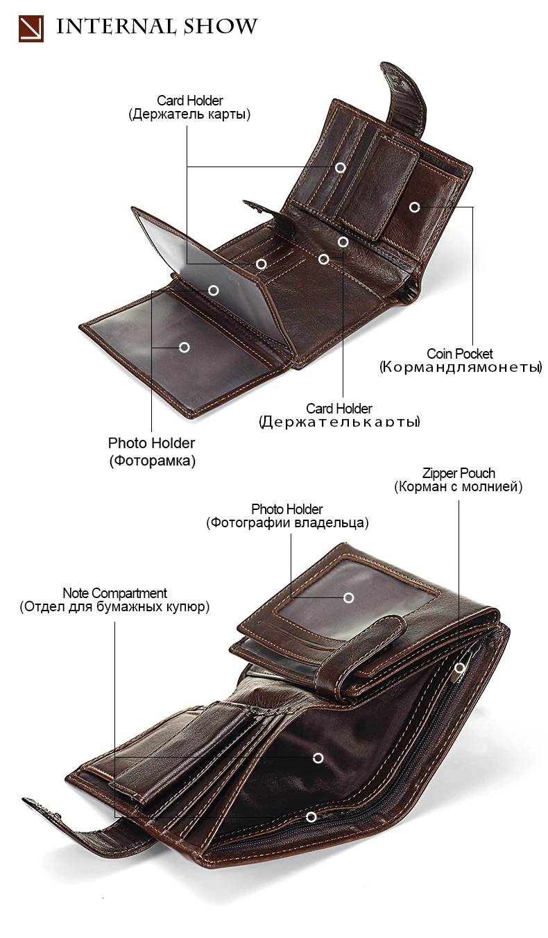 . Structure: Card Holder, Note Compartment, Photo Holder, Coin Pocket, Zipper Pouch . |