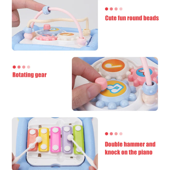 2. It is a music toy for toddler as well, which has drum on the top, piano, flip book to play music. When pressing, beatting or turning over the parts, baby will hear different musics. He/she will dance with the music