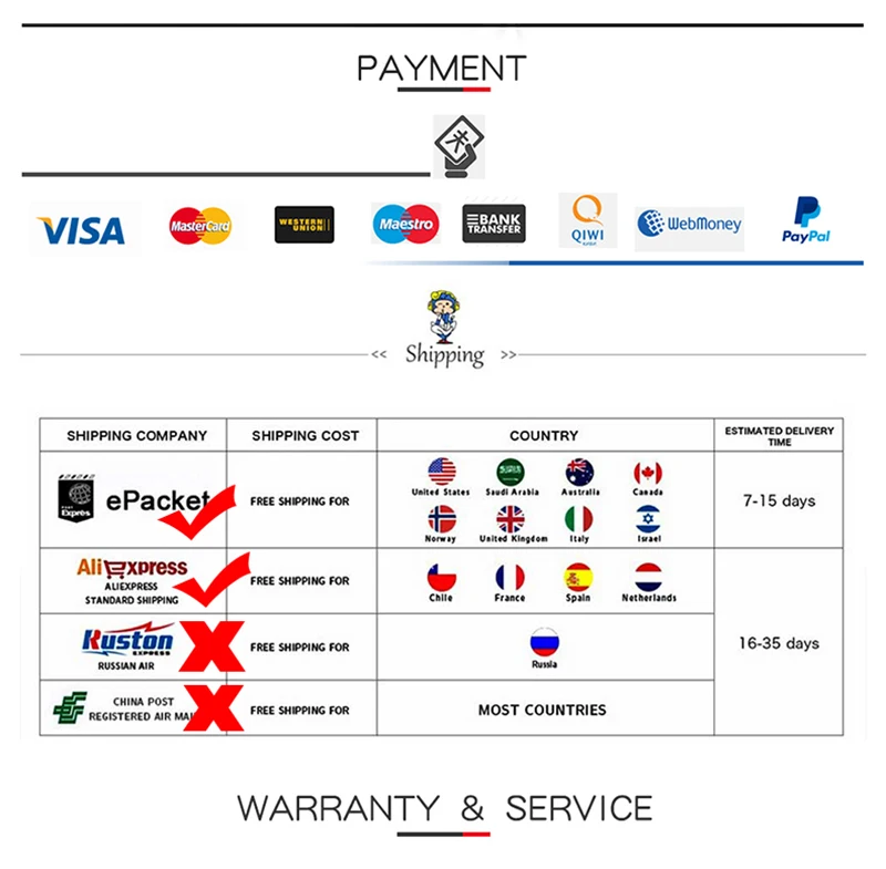 Packages from our warehouse in China will be shipped by ePacket or EMS depending on the weight and size of the product. Packages shipped from our US warehouse are shipped through USPS.