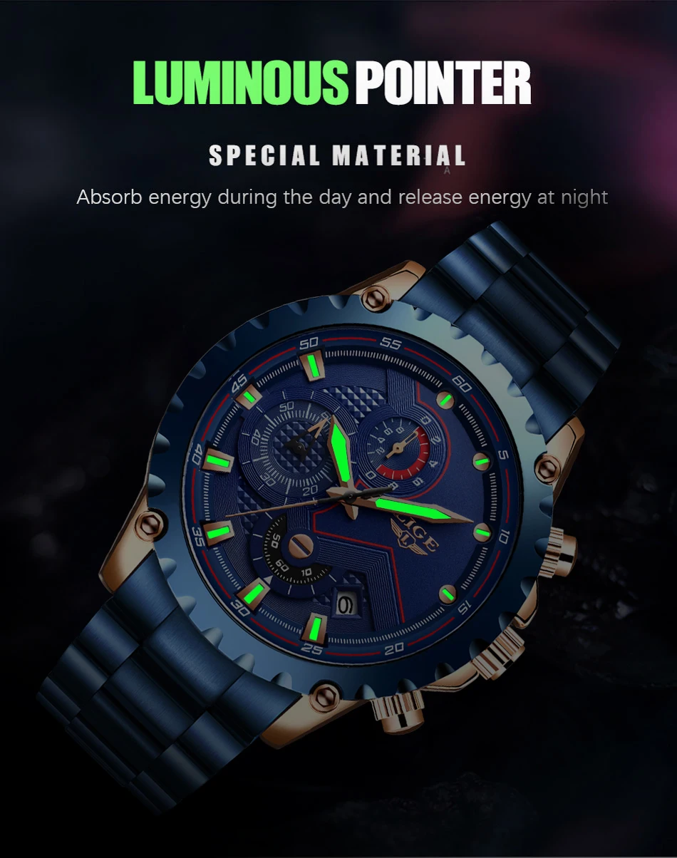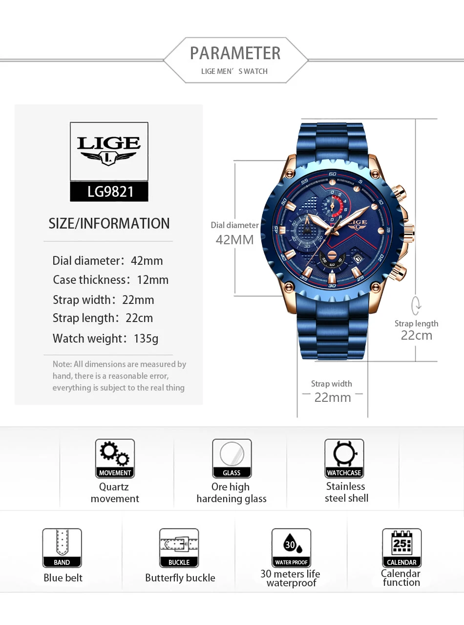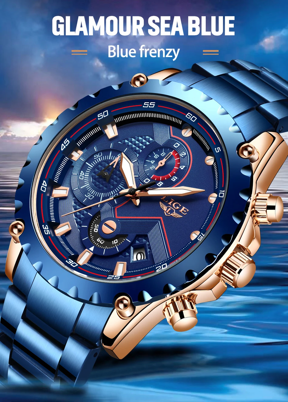 LIGE new watch. Stainless steel blue case men watch. This is a stylish business and leisure clock. With chronograph, automatic calendar, waterproof, shockproof, luminous and other functions; suitable for all occasions.
