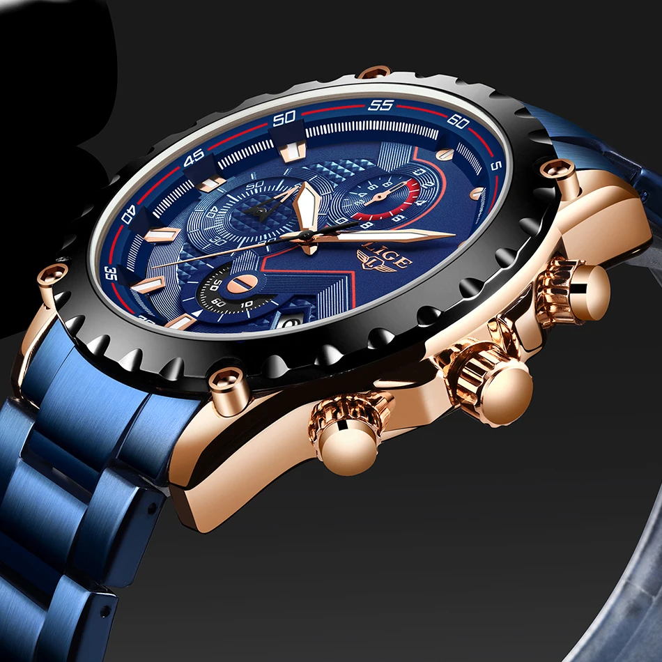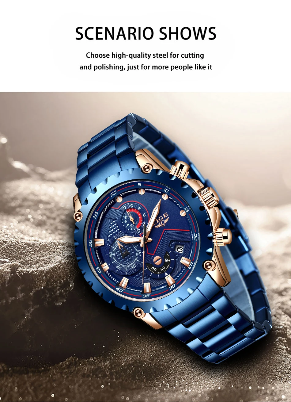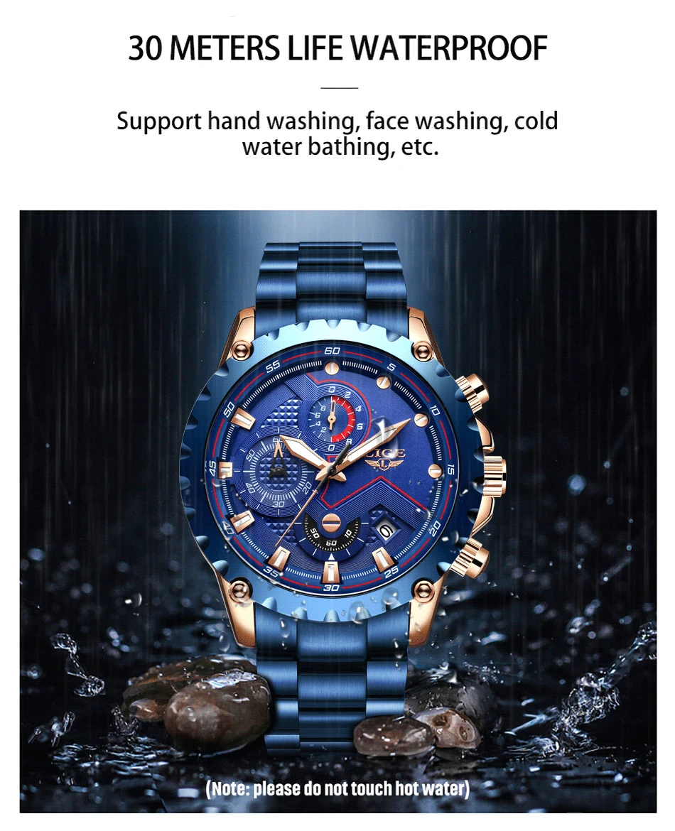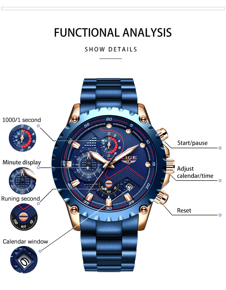 LIGE new watch. Stainless steel blue case men watch. This is a stylish business and leisure clock. With chronograph, automatic calendar, waterproof, shockproof, luminous and other functions; suitable for all occasions.