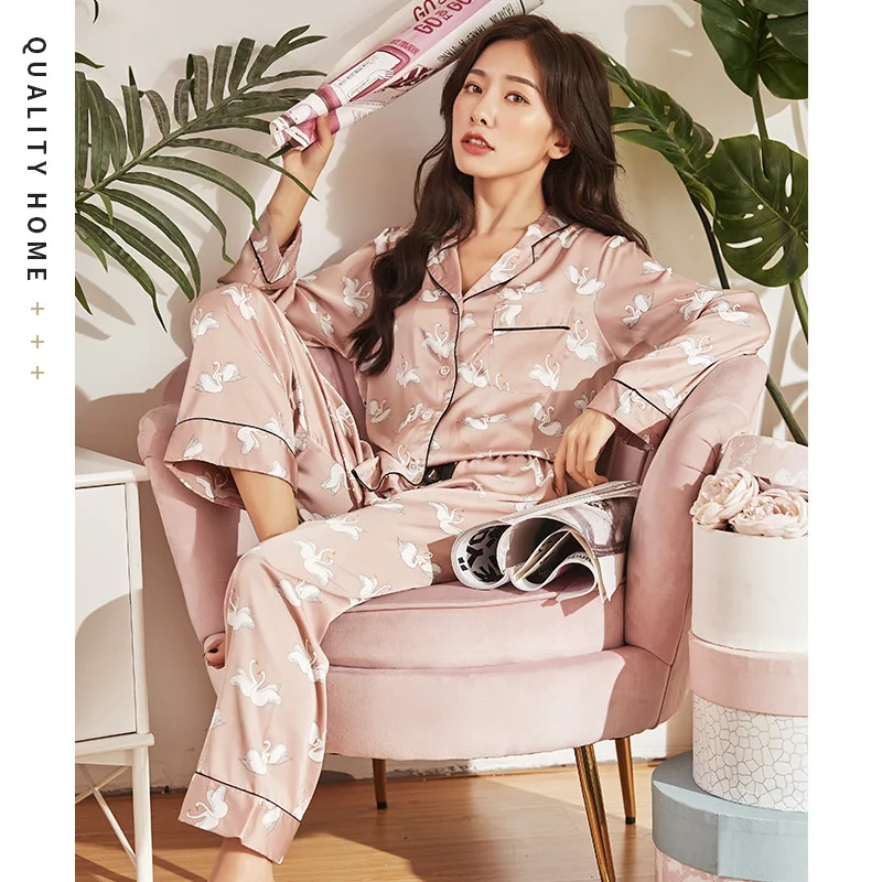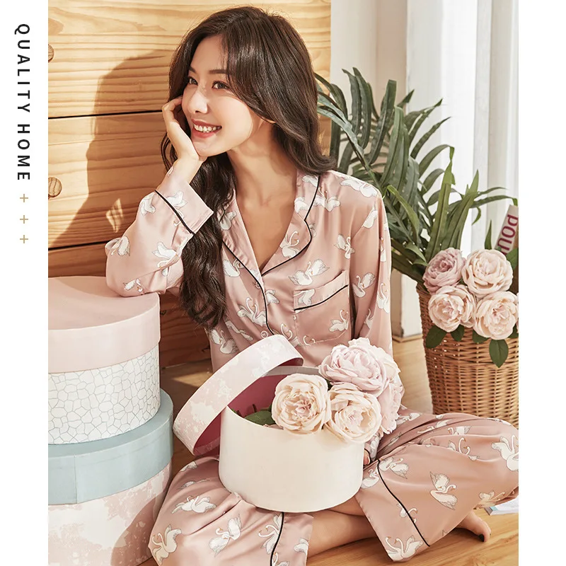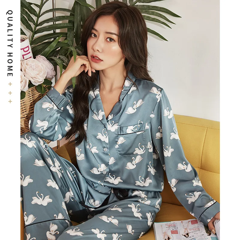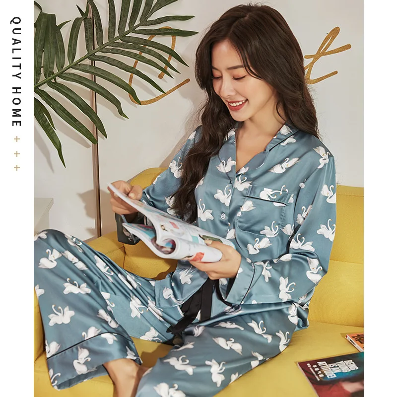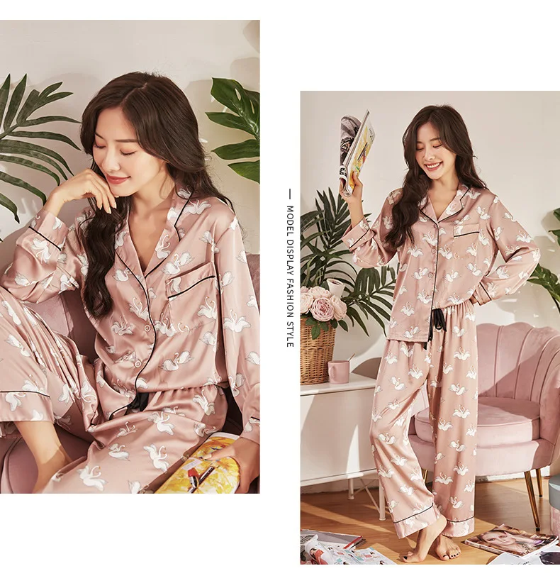 New Autumn Women Silk Satin Printing Pajamas Set Long Sleeved Shirt and Trousers Home Service Suit Satin Pajamas for Women 9903