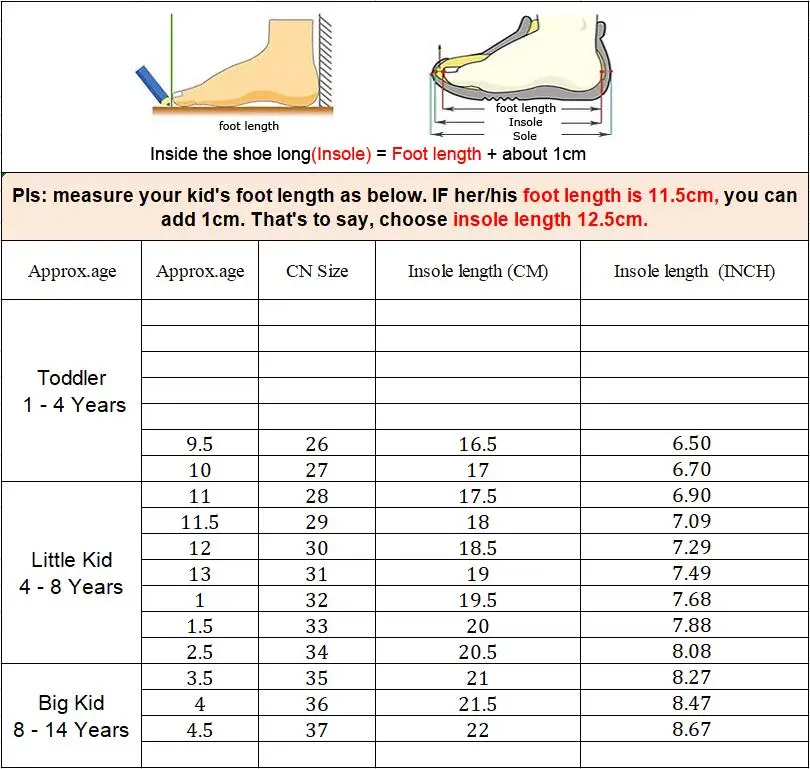 5. With regard to size, measure kids foot length cm or inch +1 cm or 0.03937 inch, select the corresponding us size, thanks
