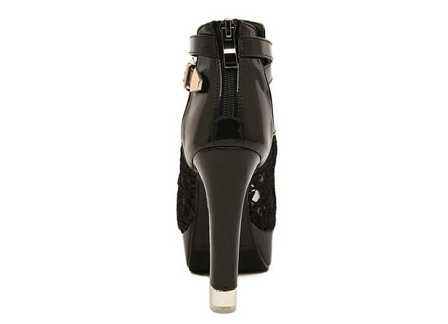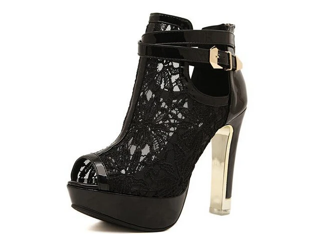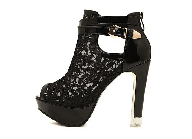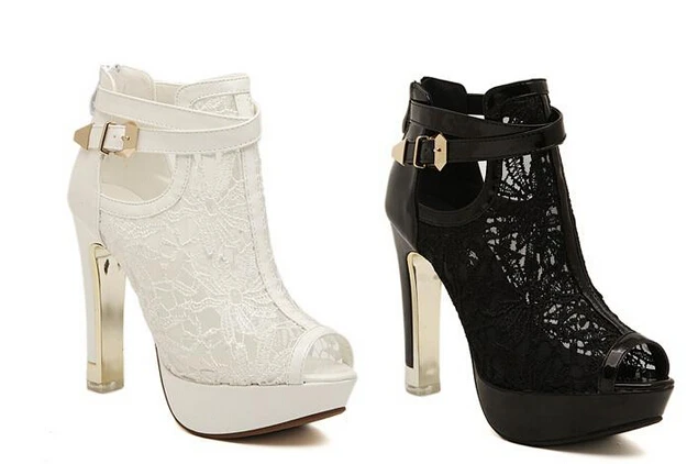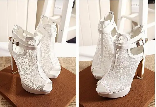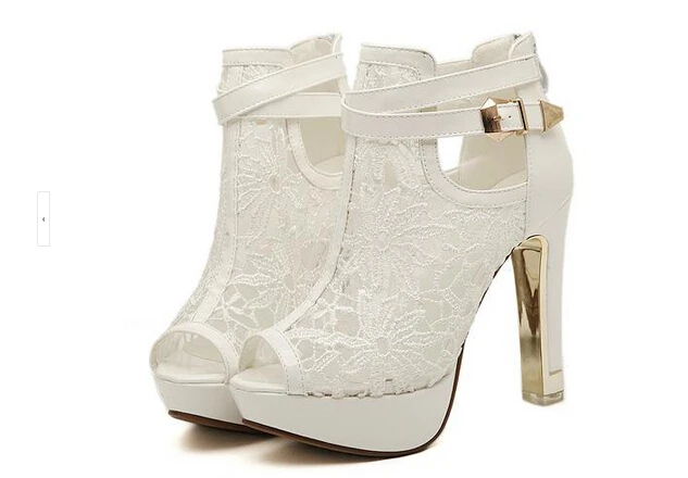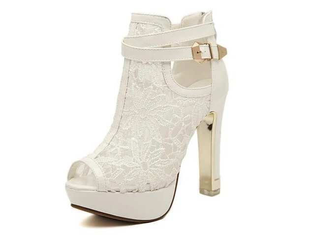 New Fashion Women High Heels White Lace Flowers Ladies Summer Shoes Buckle Strap Peep Toe Women Shoes Cut-out Zip Women Heels