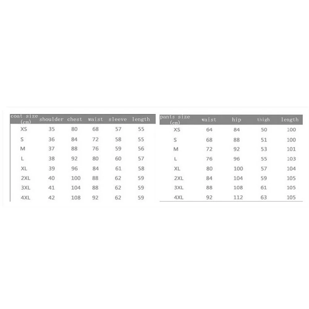. Jacket length = ?11. pants Length = ?12. Thigh = ?