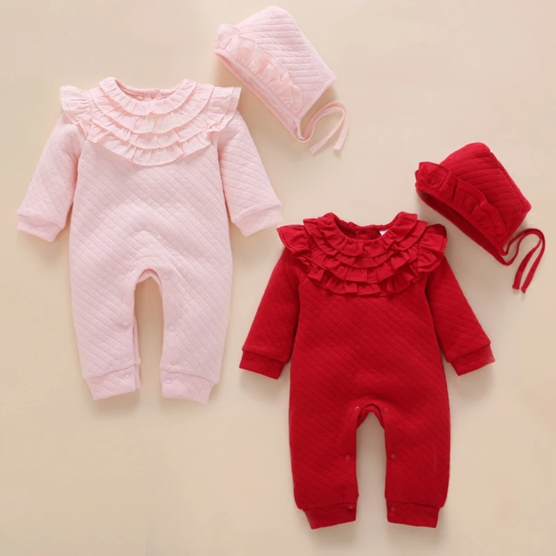 newborn autumn winter thick lace romper baby girls pink air cotton warm rompers+kids hat baby clothes infantil jumpsuit coveralls set