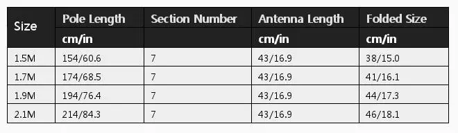 Size Pole Length Section Number Antenna Length Folded Size