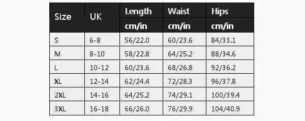 | Size::S | UK::6-8 | Length(cm/in)::56/22 | Waist(cm/in)::60/23.6 | Hips (cm/in )::84/33.1 |