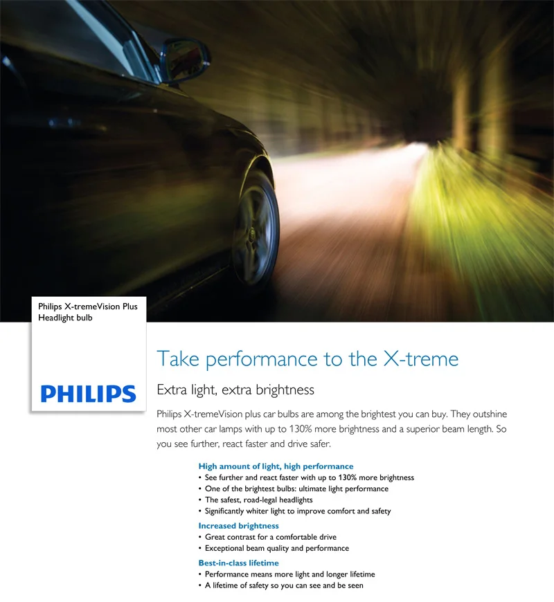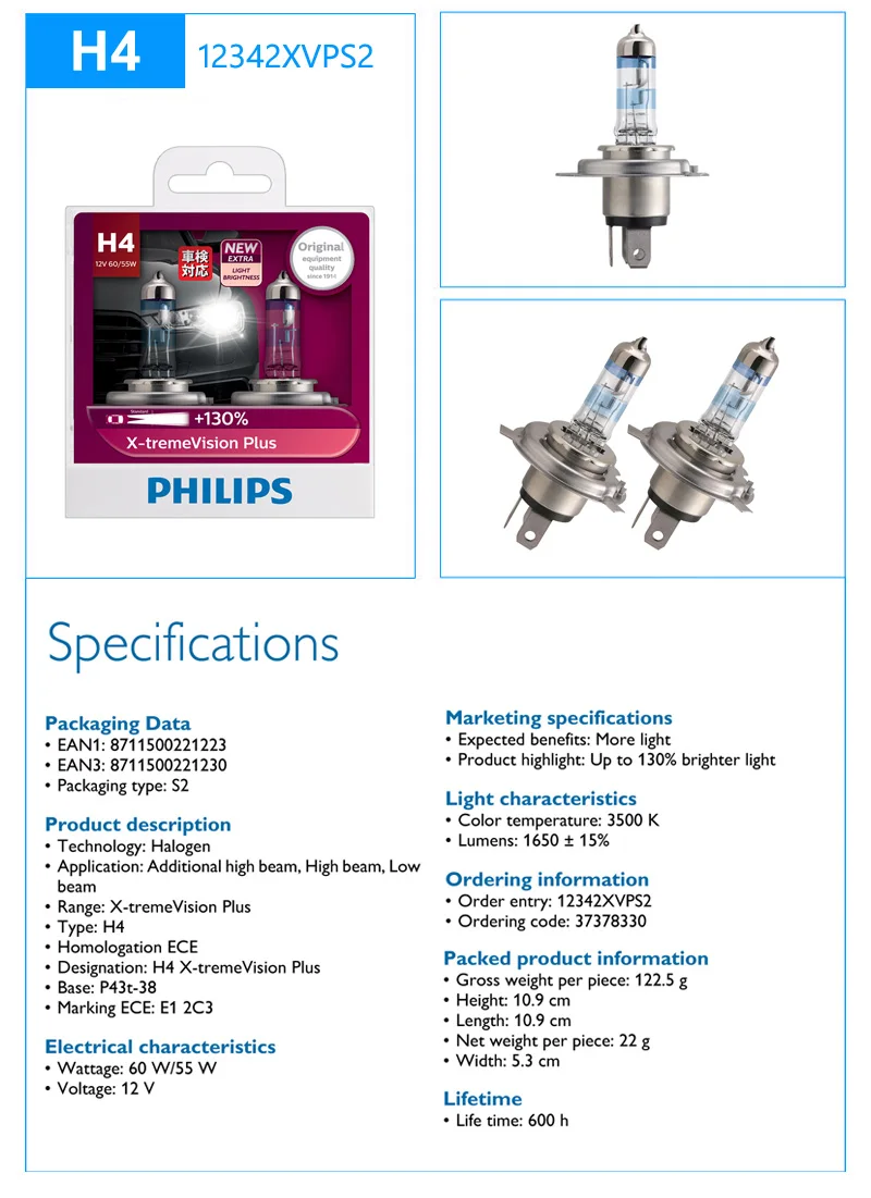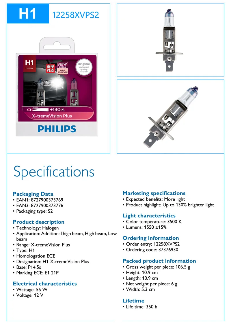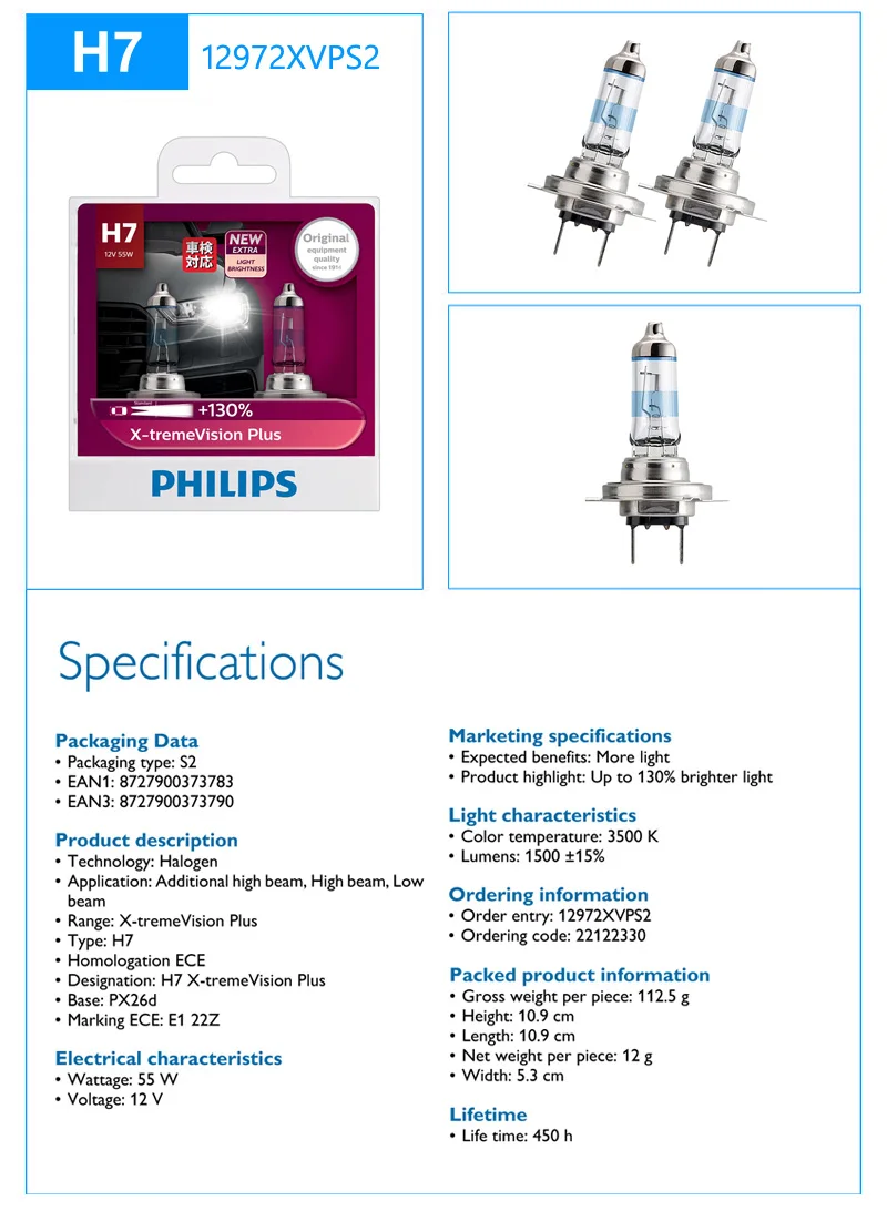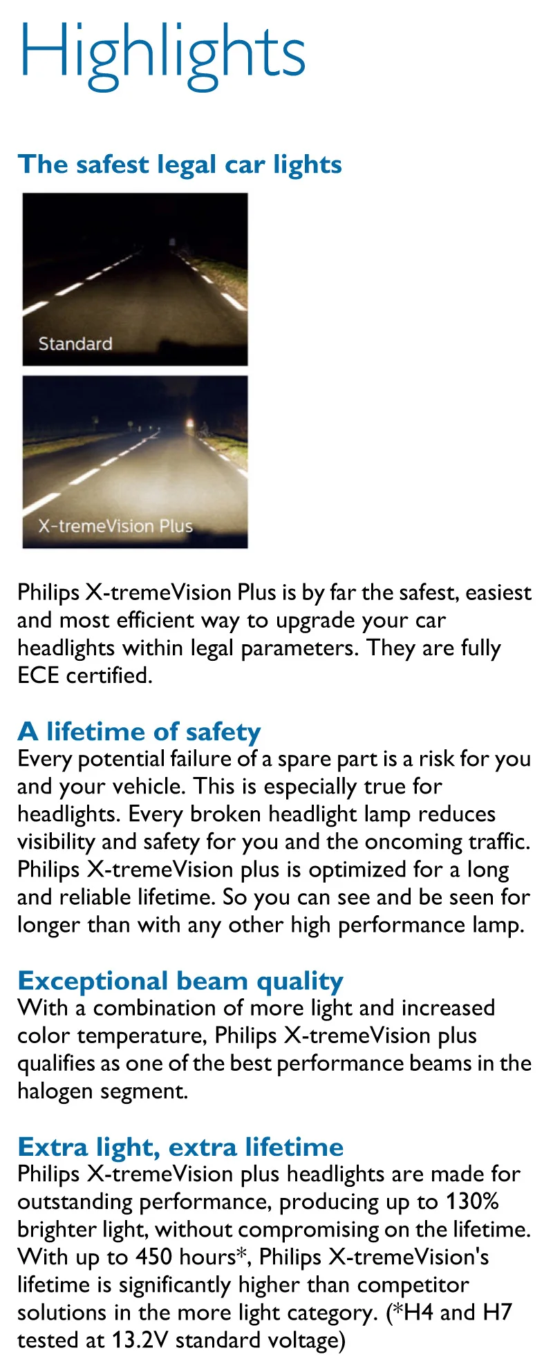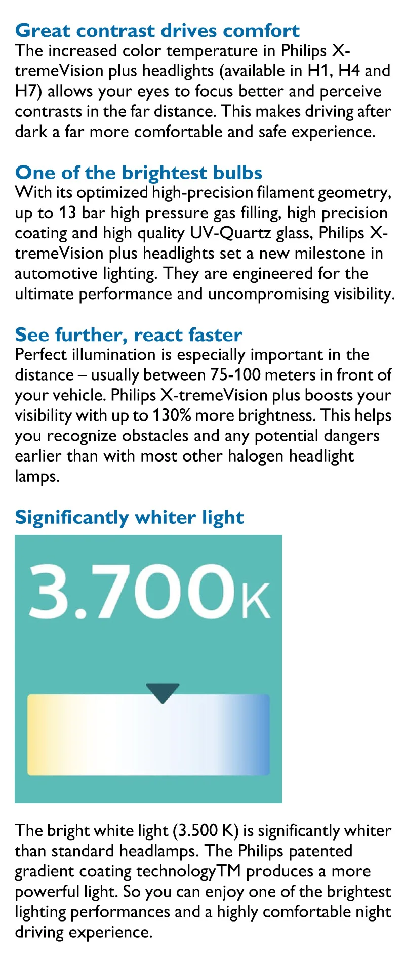 Philips H1 H4 H7 12V X-treme Vision Plus Bright Xenon White Light Car Halogen Headlight Car Lamp ECE Approve 130% Brighter, Pair