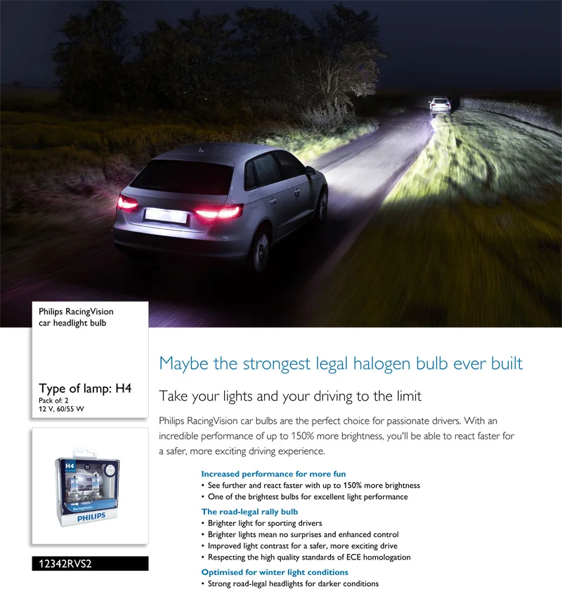 Sporting drivers expect more performance from their cars. Bringing up to 150% more brightness on the road, Philips RacingVision bulbs are homologated to provide you with a fun experience both on the road and off-road.