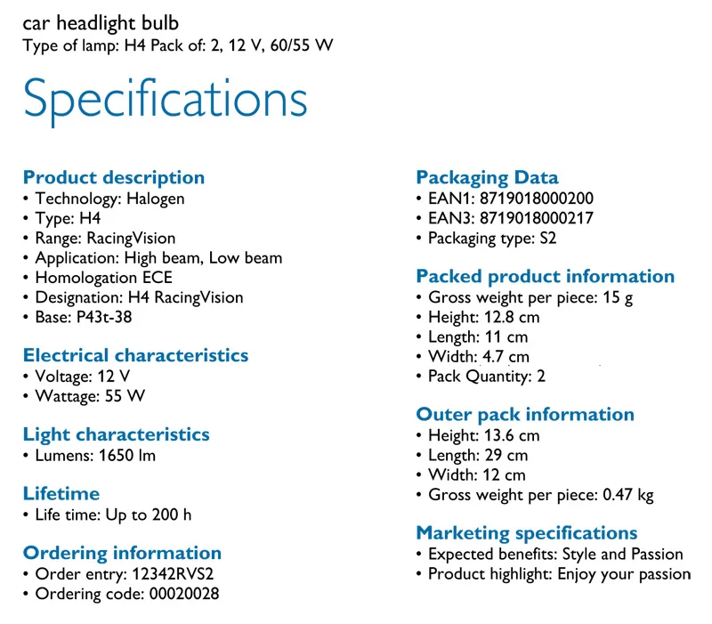 Philips H4 Racing Vision +150% 9003 12V More Bright Car Headlight Hi/lo Beam Halogen Lamp Rally Performance ECE 12342RV S2, Pair