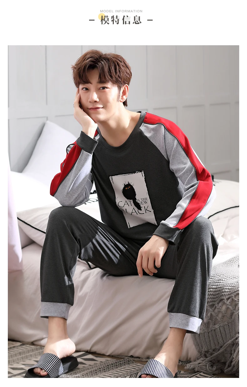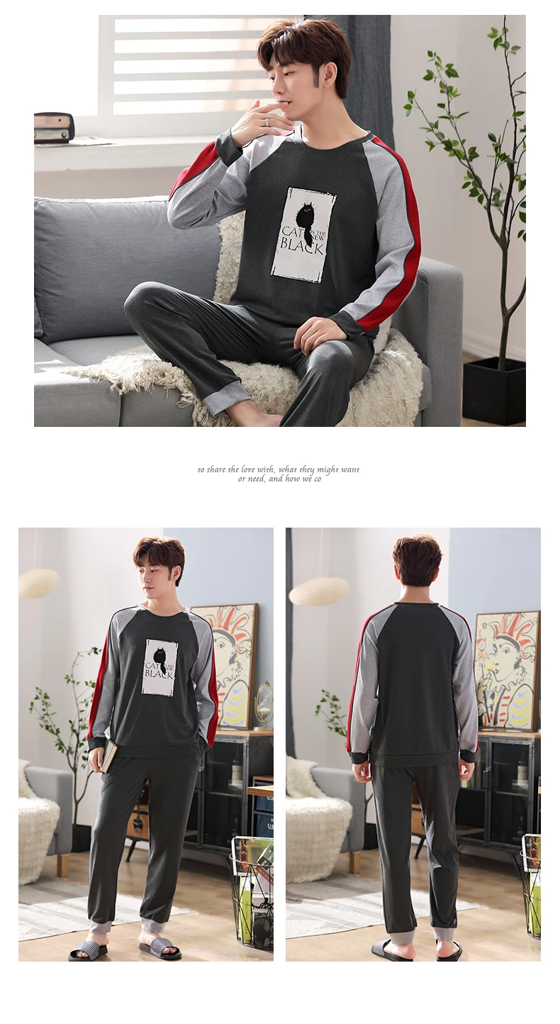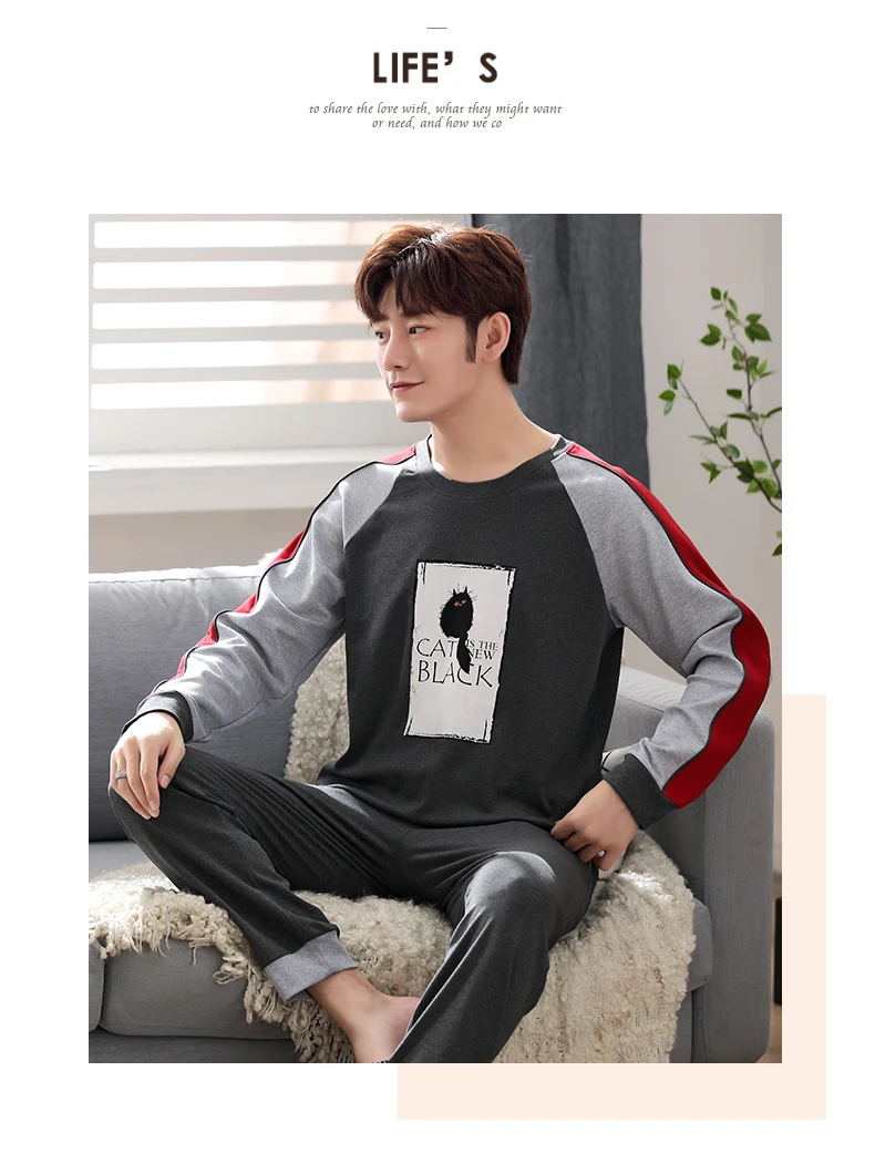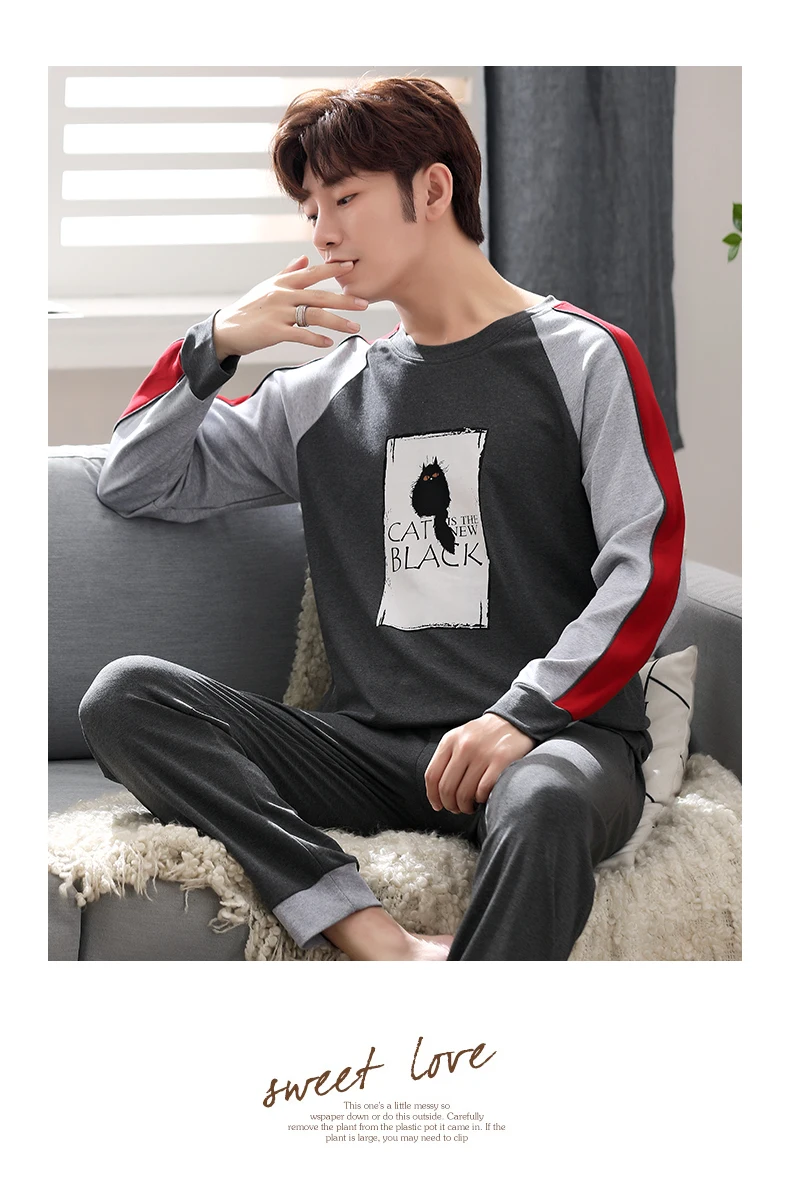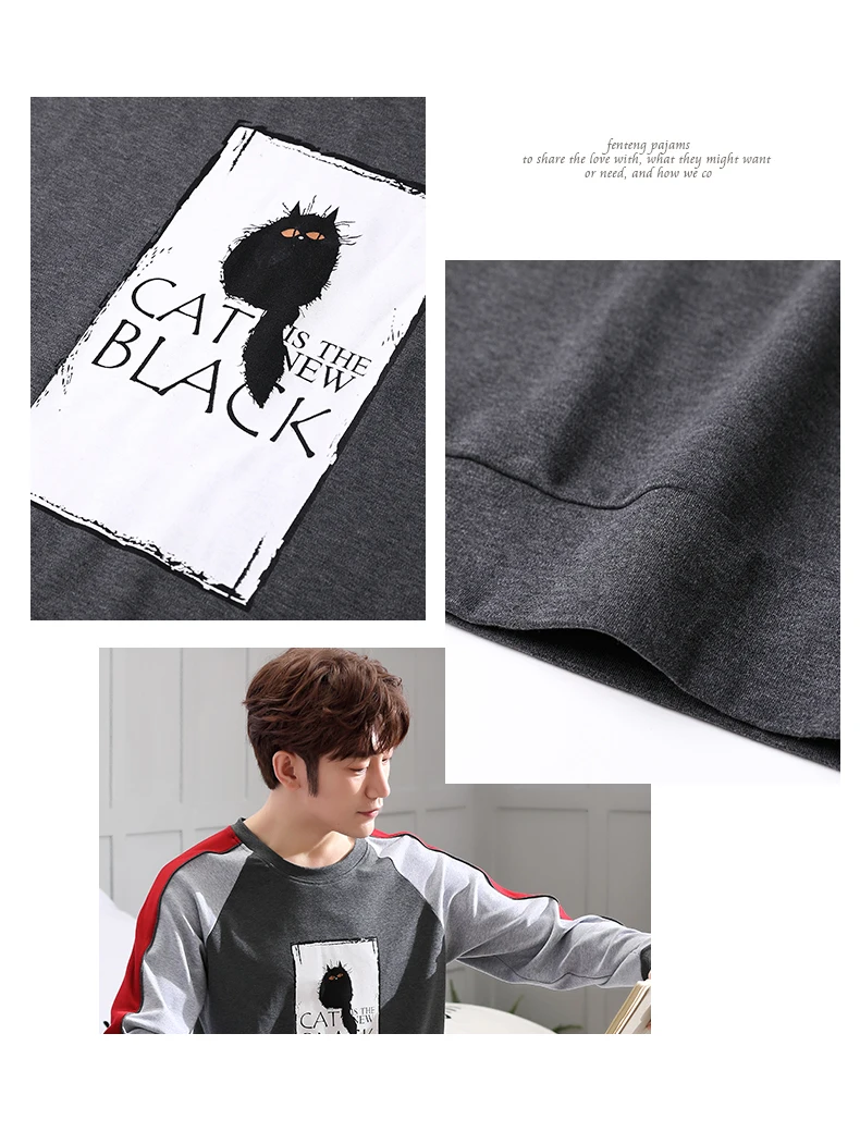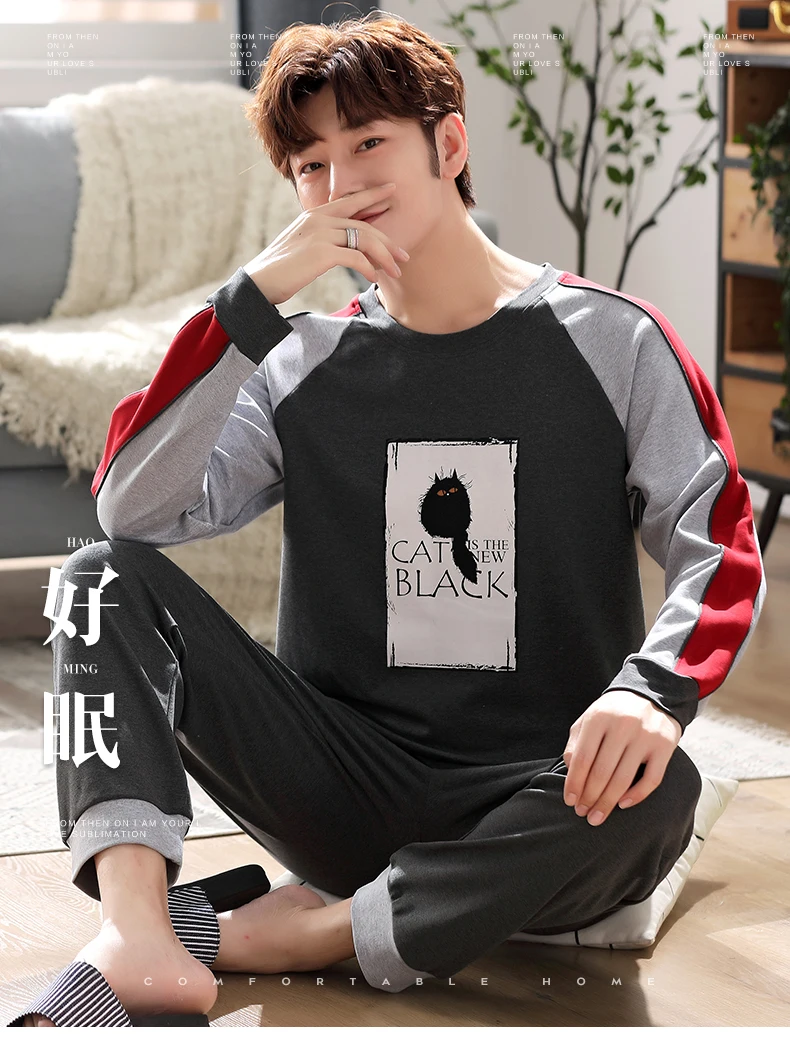 Pijama Man Set 100% Cotton Men Sleepwear Big Size Pajamas 3xl 4xl 5xl Sporty Style Men Pijama Black Cat Printing Mens Home Wear