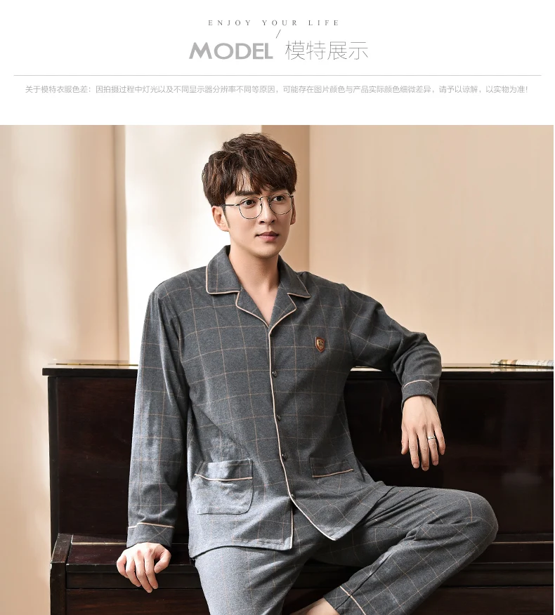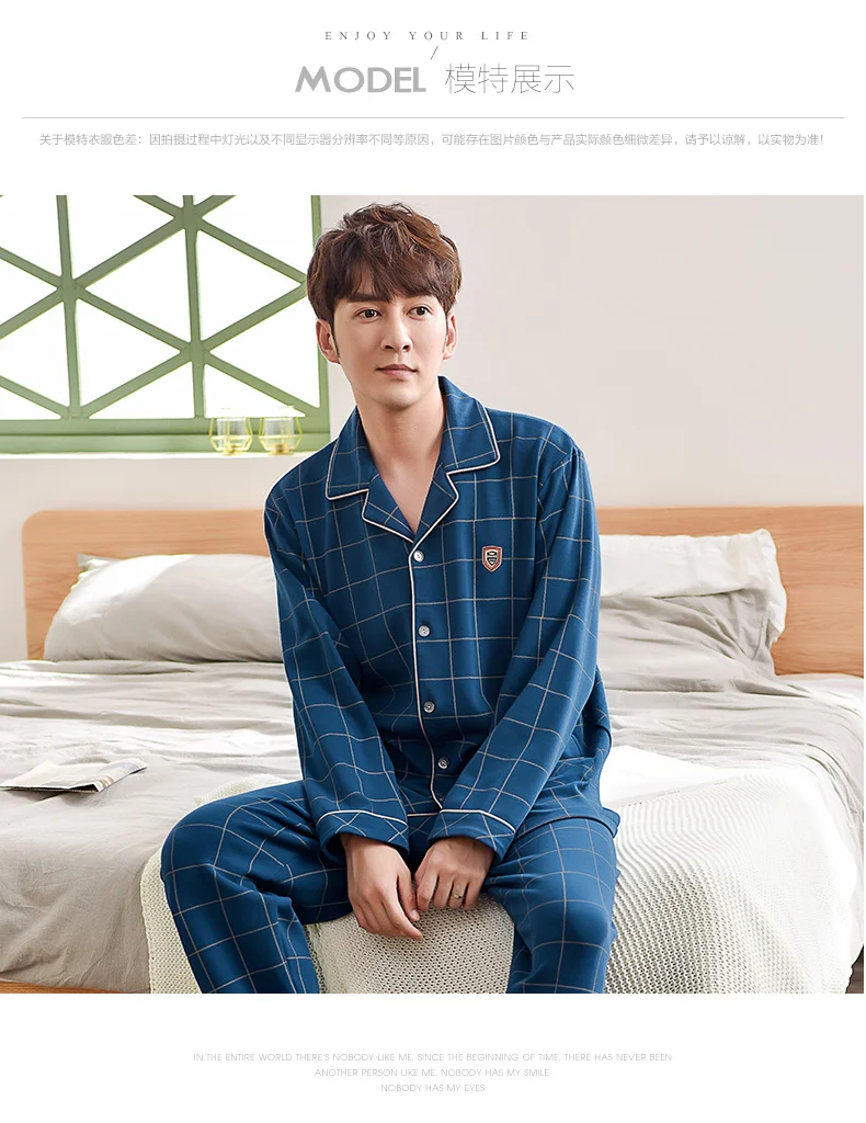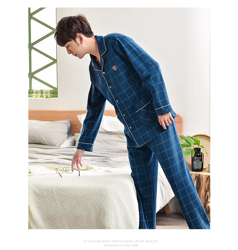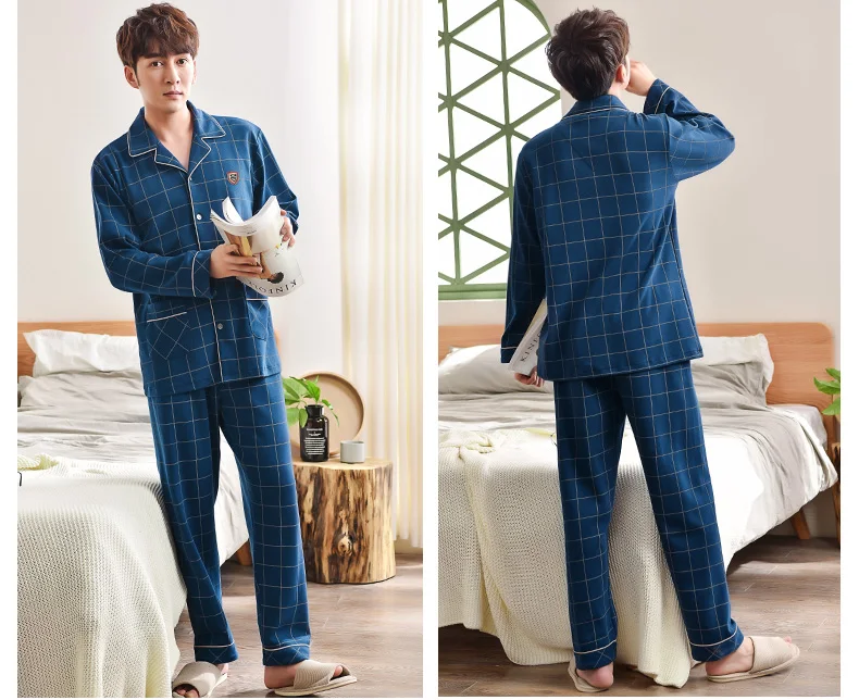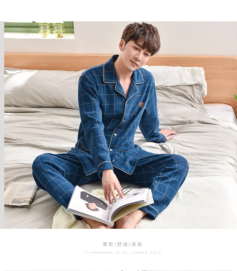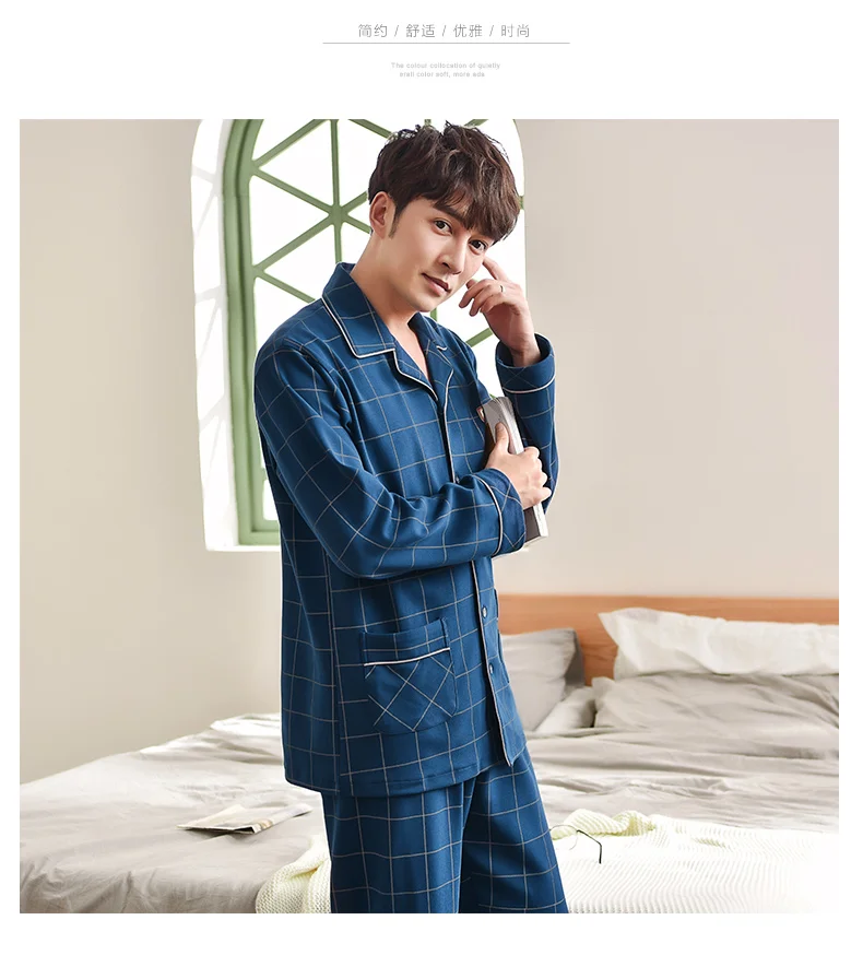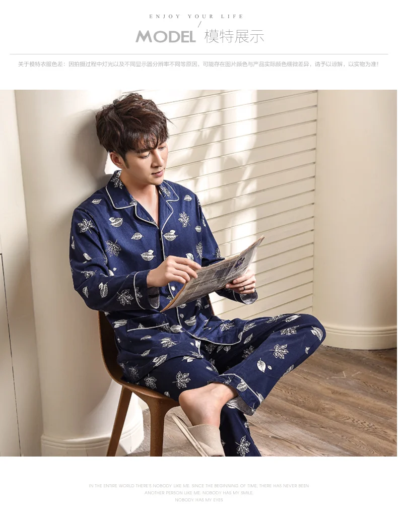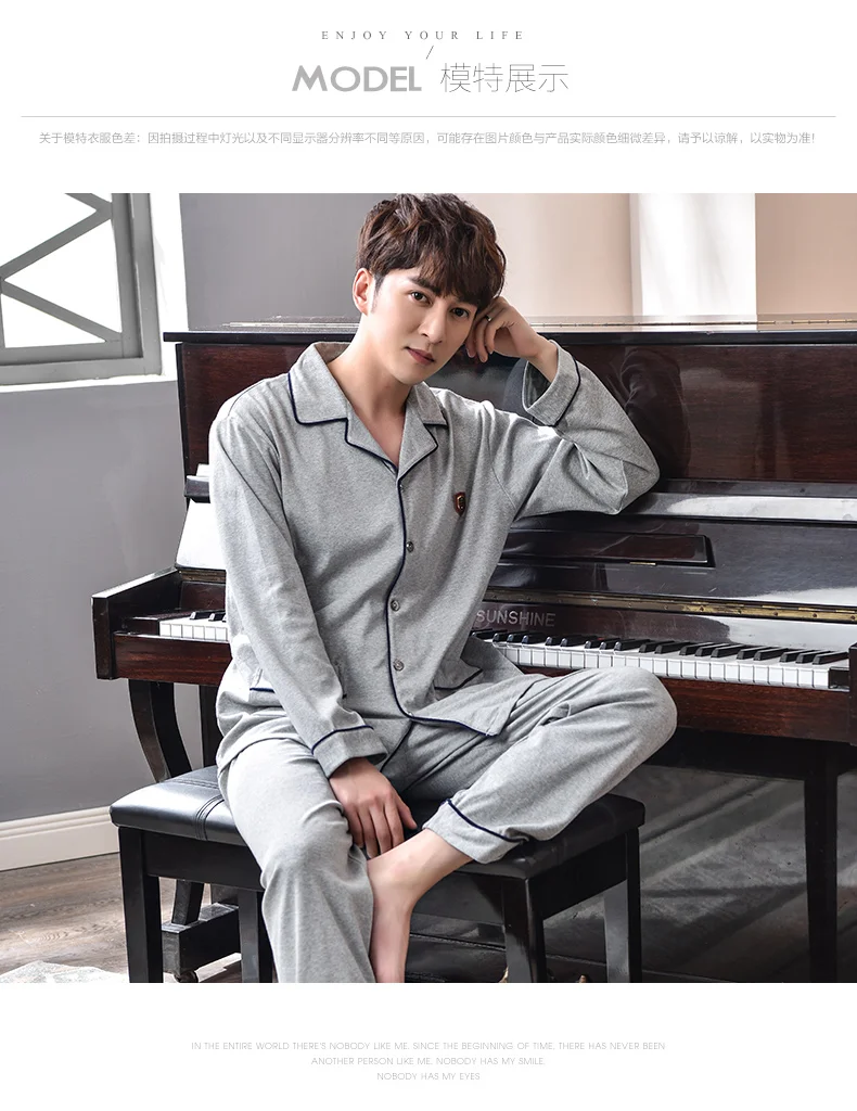 Pjs Male New 100% Cotton Mens Sleepwear Pyjama Homme Pajamas Men Pajama Set Lapel Cardigan Pijama 2 Pcs Long Sleeves Home Wear