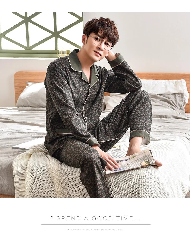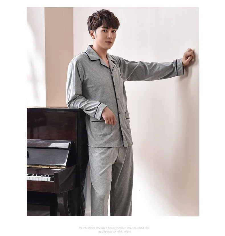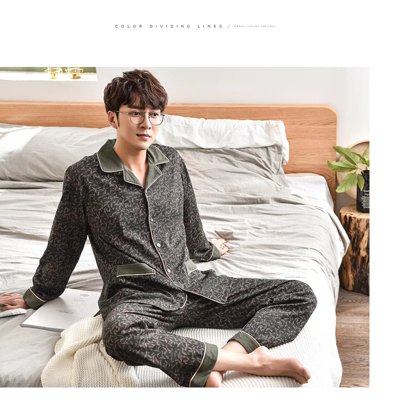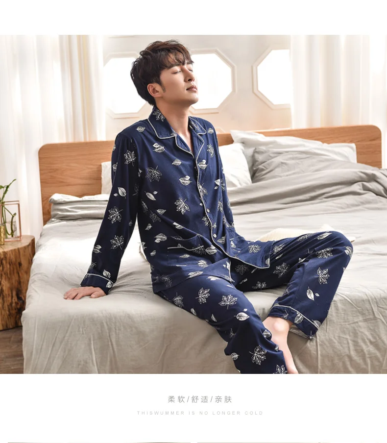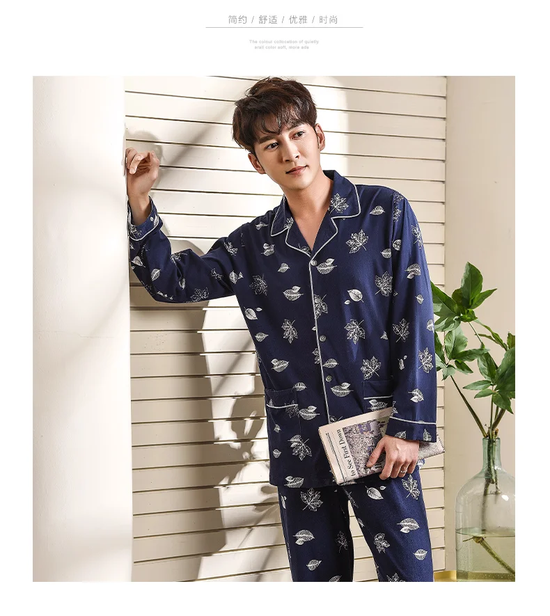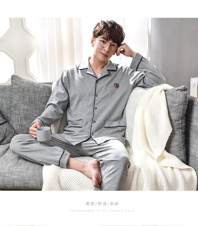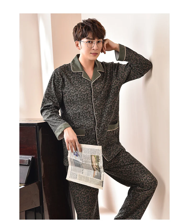 Pjs Male New 100% Cotton Mens Sleepwear Pyjama Homme Pajamas Men Pajama Set Lapel Cardigan Pijama 2 Pcs Long Sleeves Home Wear