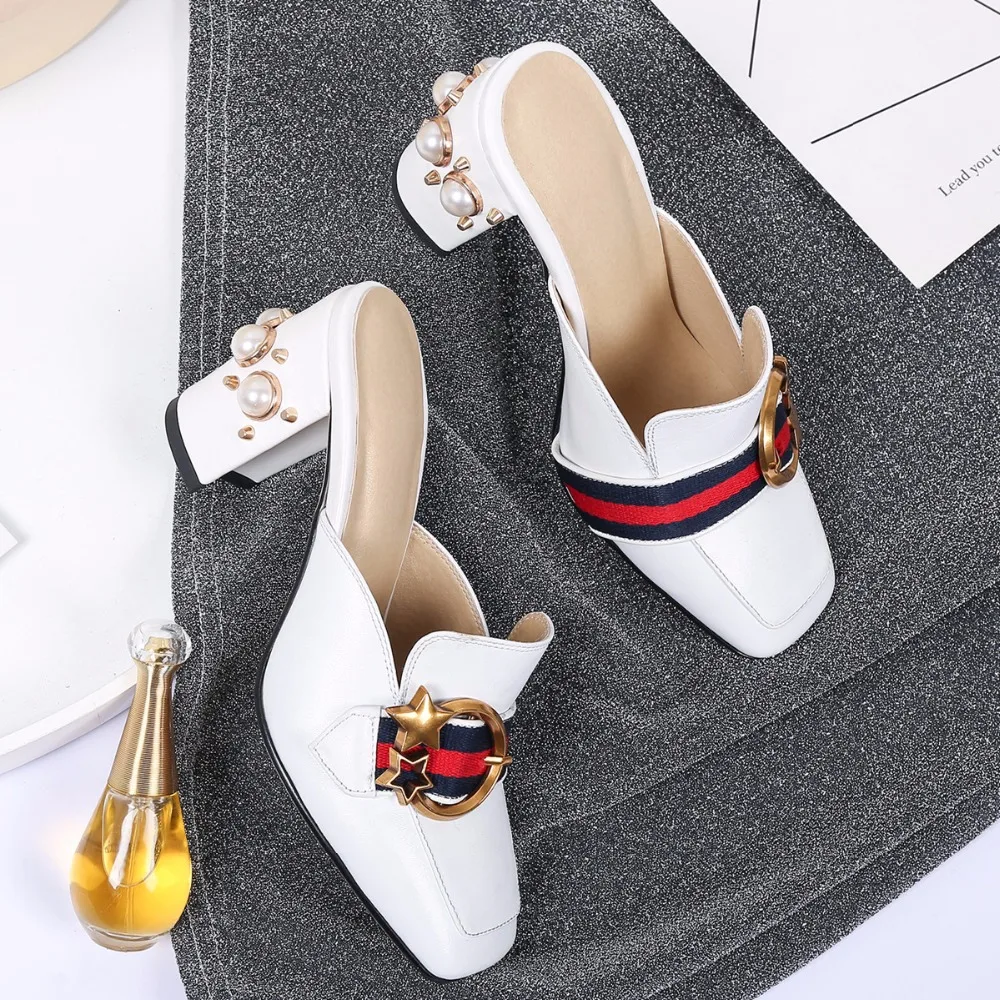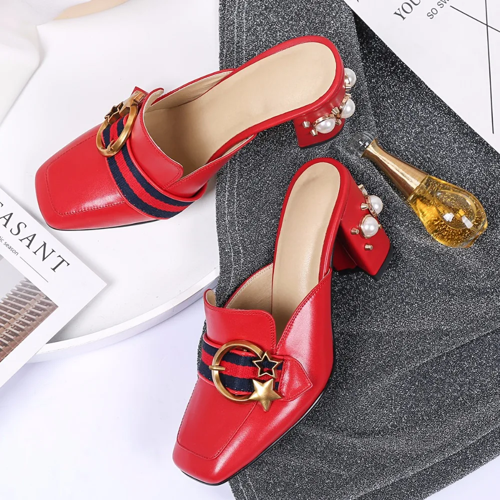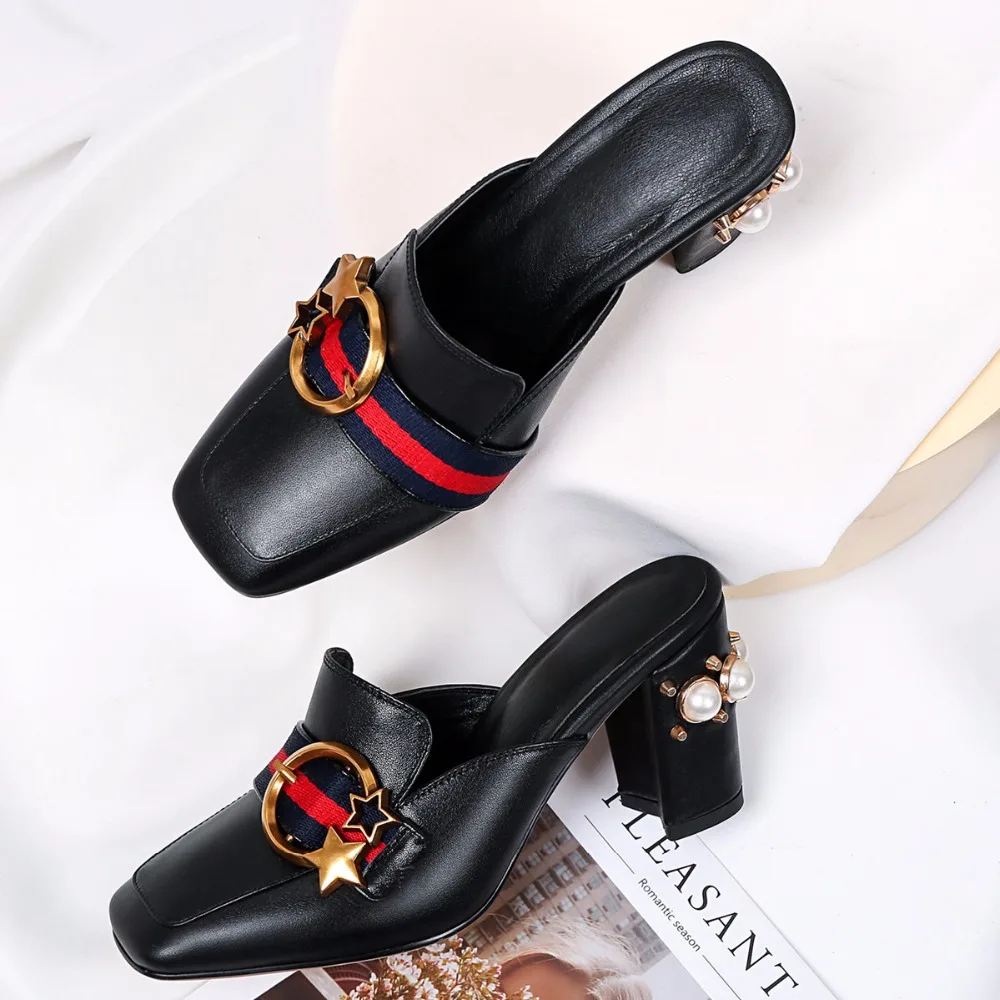Plus size 33-40 women’s thick high heel summer slides brand designer metal buckle sexy ladies beach sandals comfortable shoes