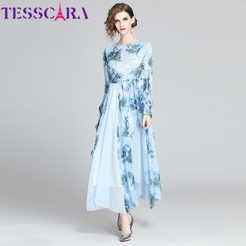 TESSCARA Women Long Maxi Elegant Floral Dress Festa High Quality Blue Party Robe Femme Vintage Designer Lantern Sleeve Vestidos