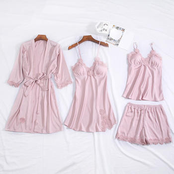 QWEEK Satin Sexy Lace Pajamas Four-piece Set Pyjama Silk Homewear Spaghetti Strap Pijama Women Sleepwear with Chest Pads